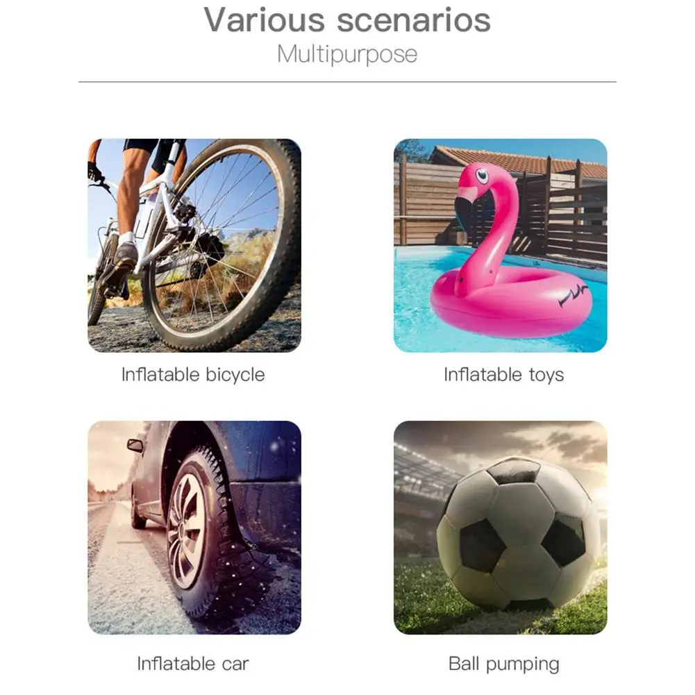 Упаковочный лист:1 * воздушный компрессор1 * USB кабель для зарядки1 * воздушный шланг1 * клапан Presta1 * шариковая игла1 * игрушечная насадка