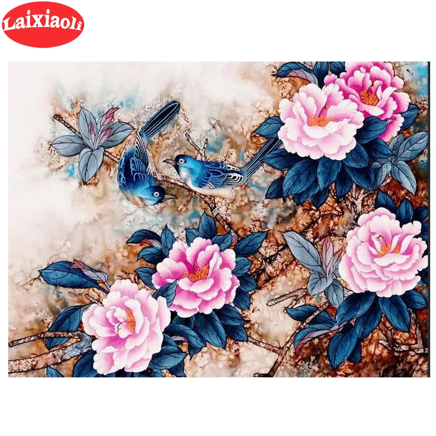 Алмазная картина, пионы, птицы, алмазная вышивка, полный квадраткруглая дрель, пазлы, подарки на новый год 2020, украшение, laixiaoli