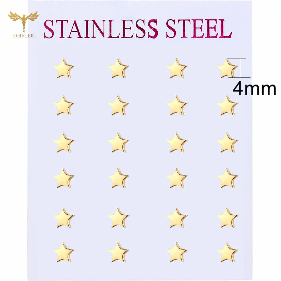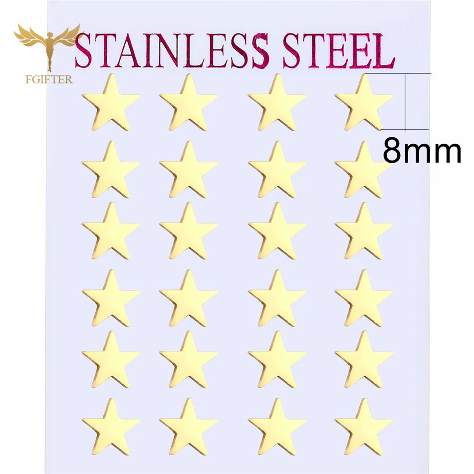 Материал: нержавеющая стальКачество на 100% абсолютно новый высокое качествоЦвет: золотые серьги со звездойРазмер: серьги-гвоздики со звездами 6 мм, 8 ммОбратите внимание: круглая модель вырезана машиной, размер имеет погрешность 0-1 мм, примите это во внимание.Преимущество: антиаллергенный, не выцветаетНабор: 12 пар/лот