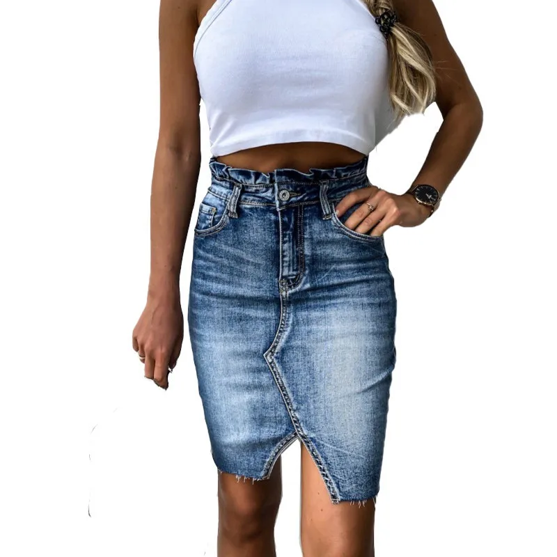Женская джинсовая юбка, повседневная легкая рваная мини-юбка с высокой талией, с оборками, лето женские юбки-карандаш