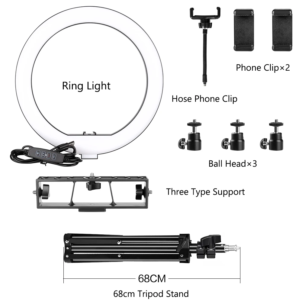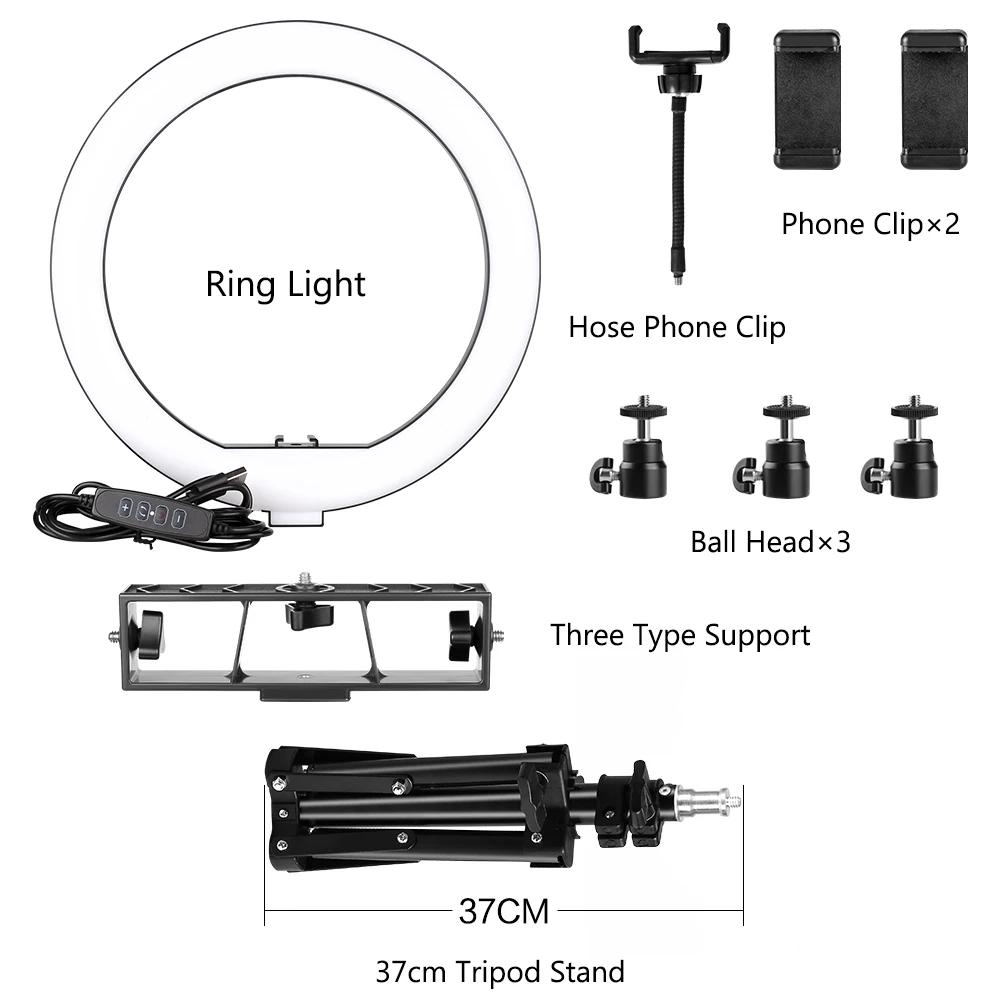 1x10 дюймов кольцевой светильник1 x зажим для телефона3 шаровая Головка2 x стандартный зажим для телефона1 х три типа поддержки1 x подставка для штатива 37 см