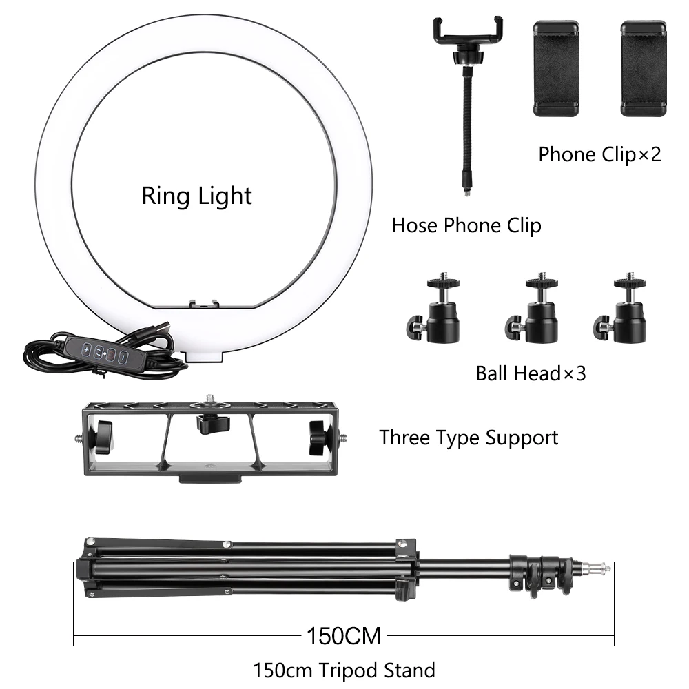 1x10 дюймов кольцевой светильник1 x зажим для телефона3 шаровая Головка2 x стандартный зажим для телефона1 х три типа поддержки1 x Штатив 150 см