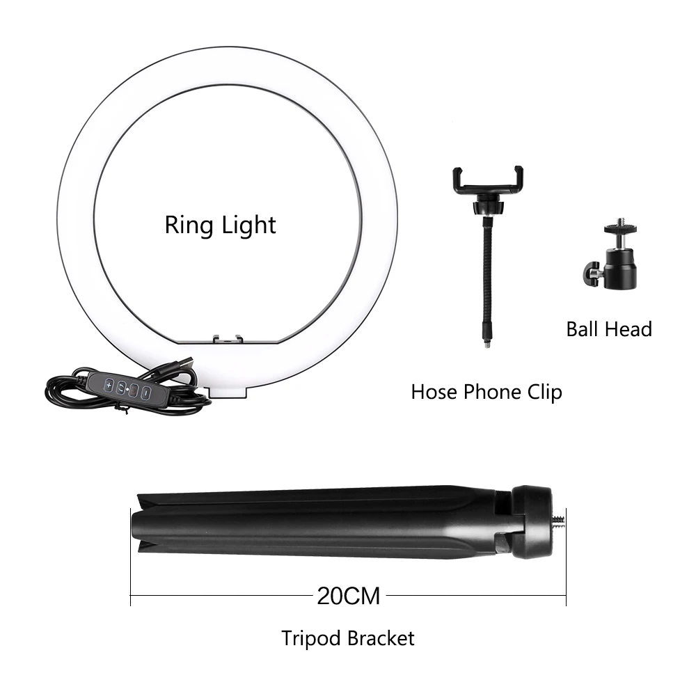 1x10 дюймов кольцевой светильник1 x зажим для телефонаШаровая Головка-1 шт.1 x кронштейн штатива