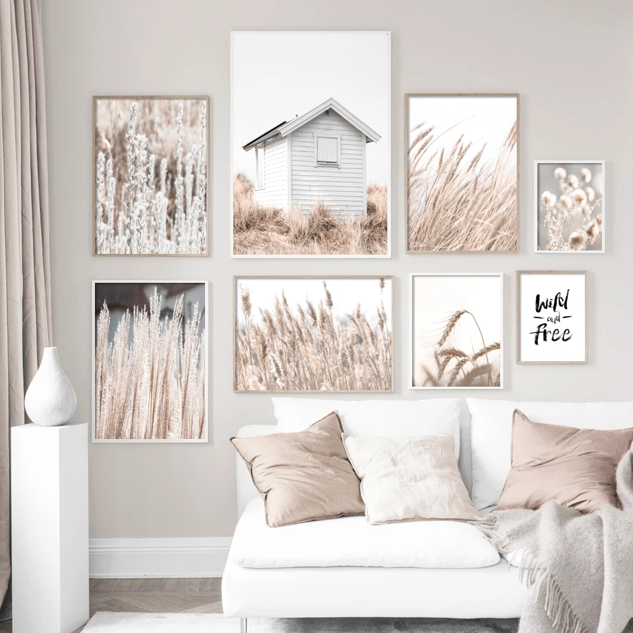 Настенная живопись, холст, бежевый тростник, сушеные цветы, плакаты...