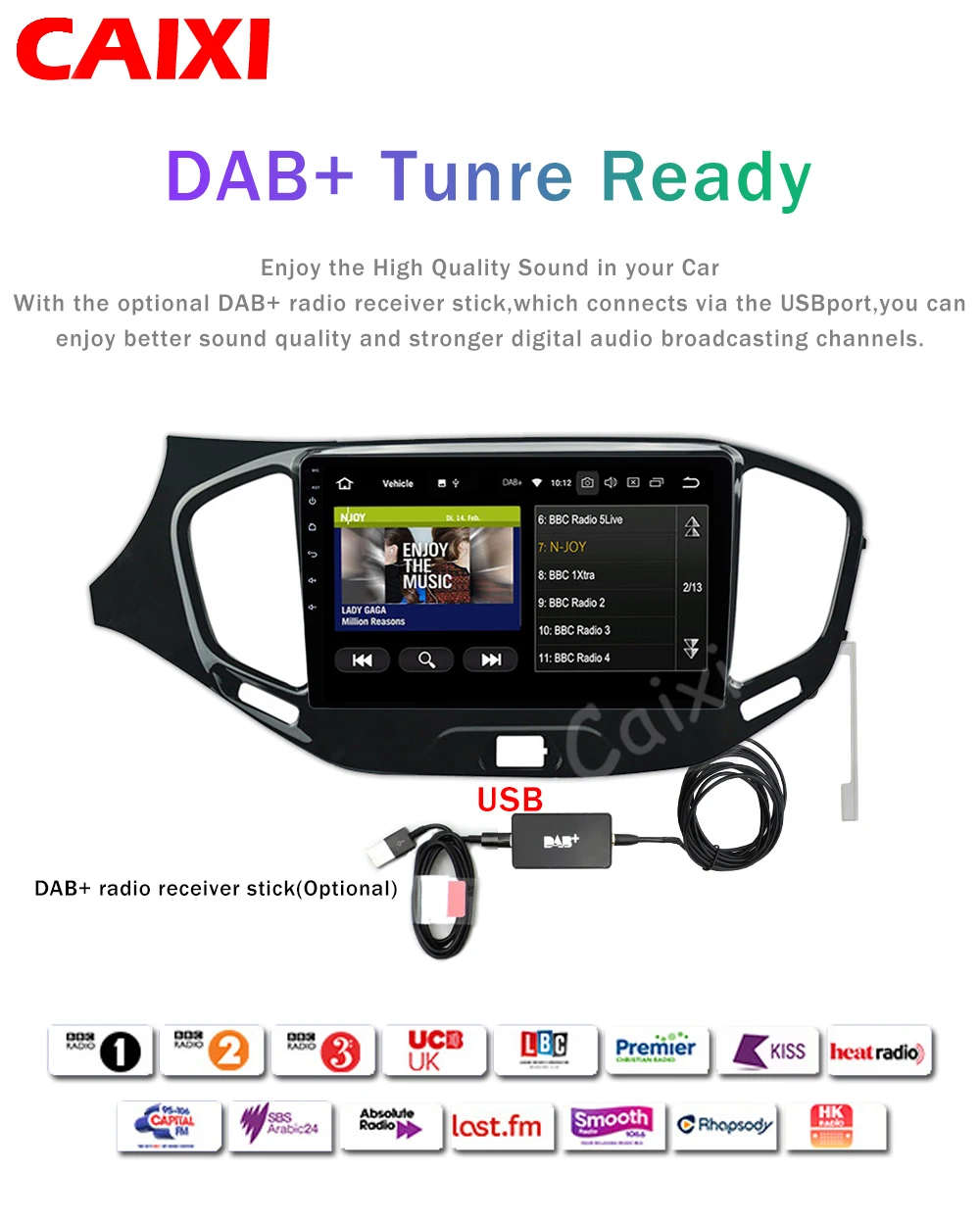 Наслаждайтесь высококачественным звуком в вашем автомобиле с помощью дополнительной палки радиоприемника DAB +, которая подключается через usb-порт. Вы можете улучшить качество звука и хранить цифровые каналы аудиовещания