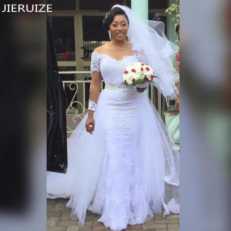 Свадебные платья JIERUIZE в африканском стиле русалки со съемным шлейфом и круглым вырезом с длинными рукавами Кружевная аппликация Свадебные платья с поясом