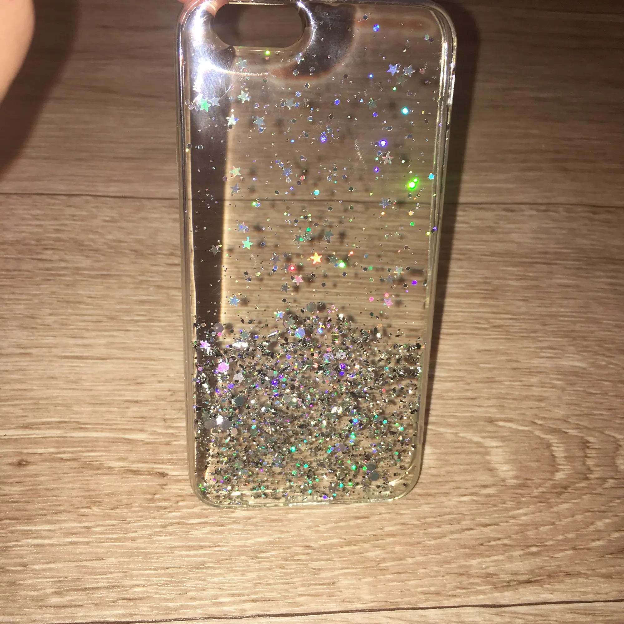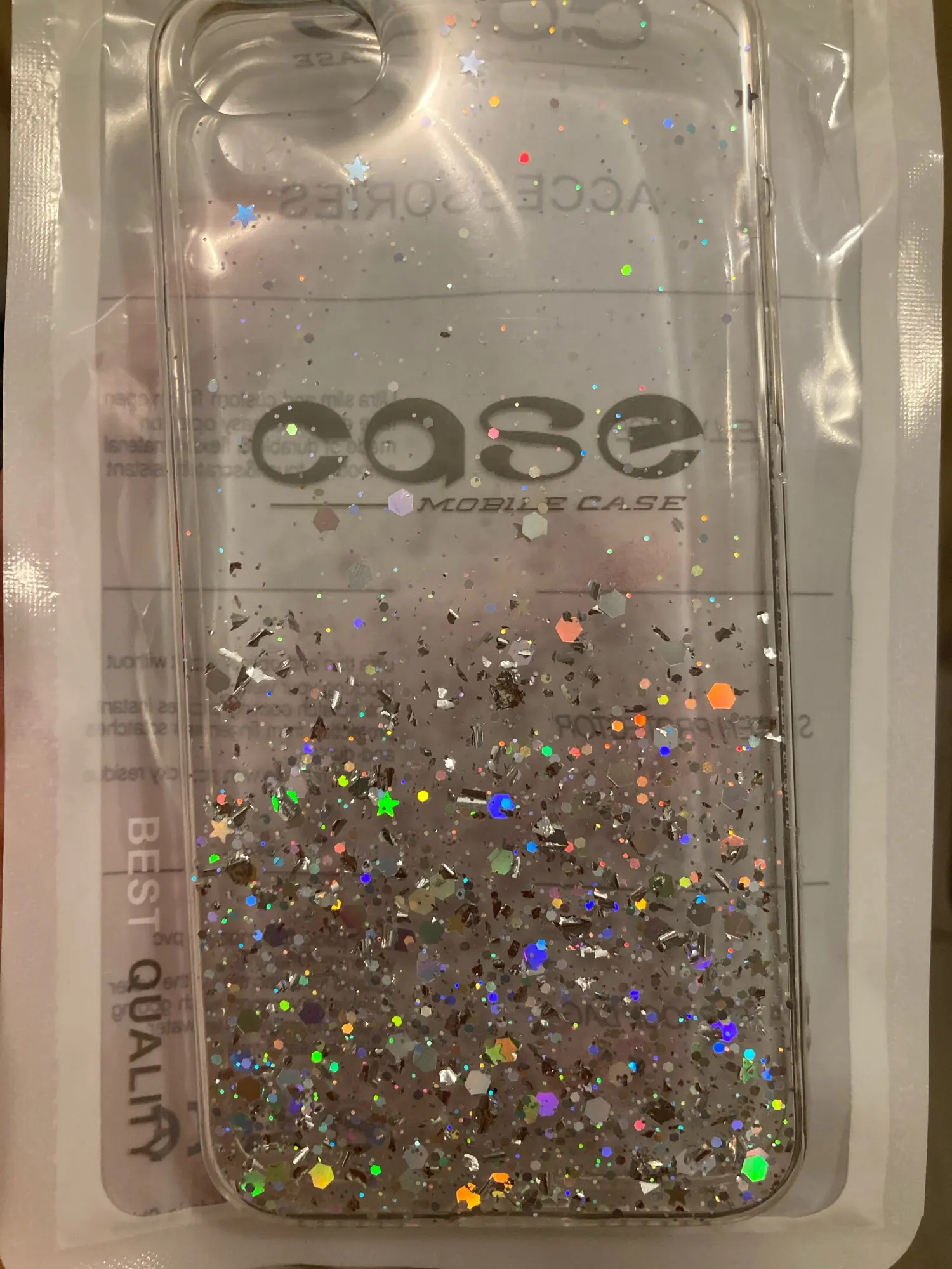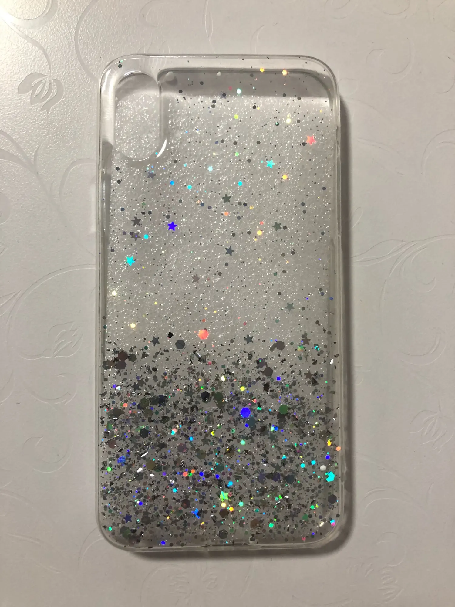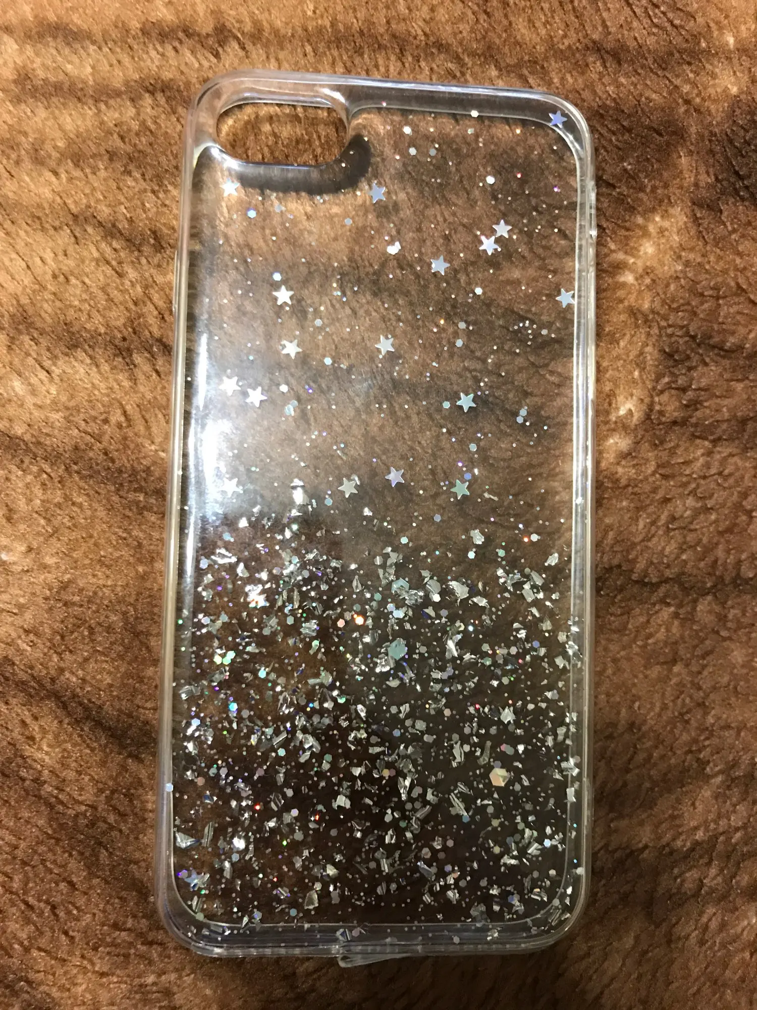 Чехол просто супер!!! Красивый! Подошёл на золотой 6 айфон! Хотя блестки серебристые, но смотрится шикарно! Плотный! Смотрится шикарно!! Пришёл быстро’!!