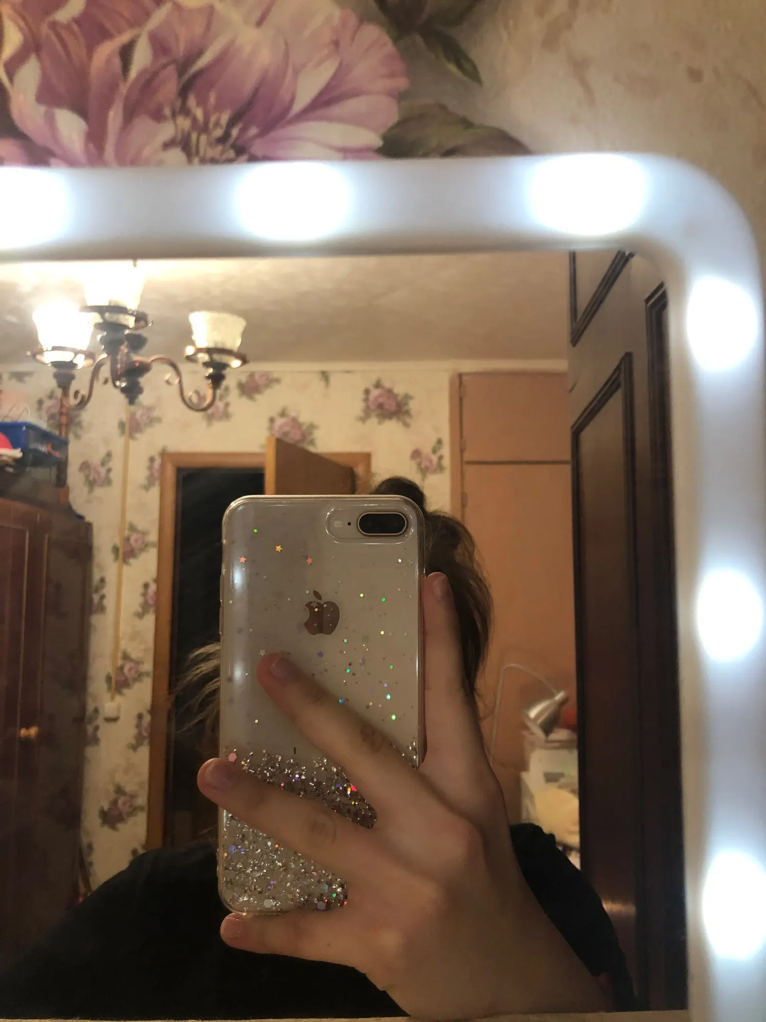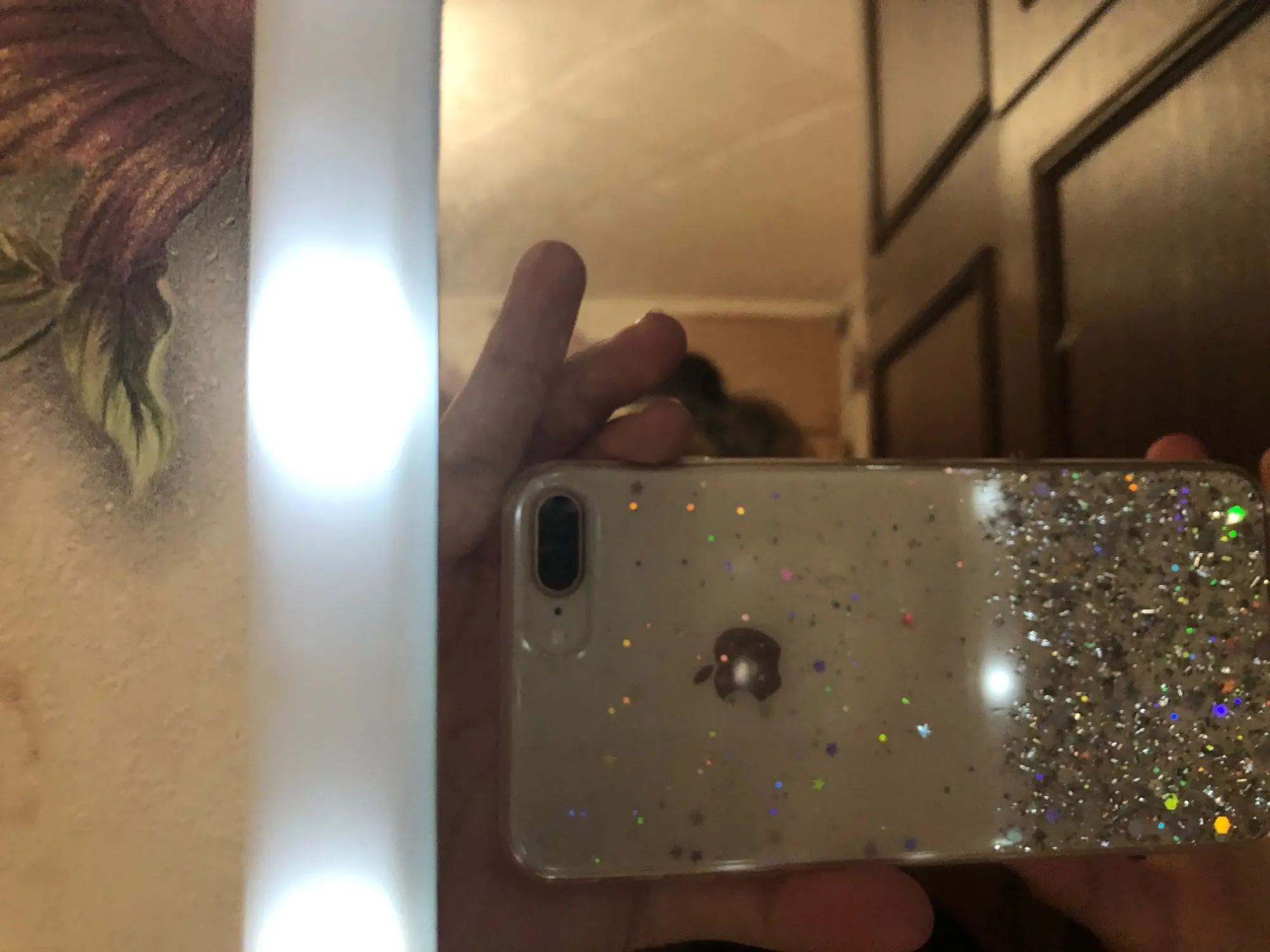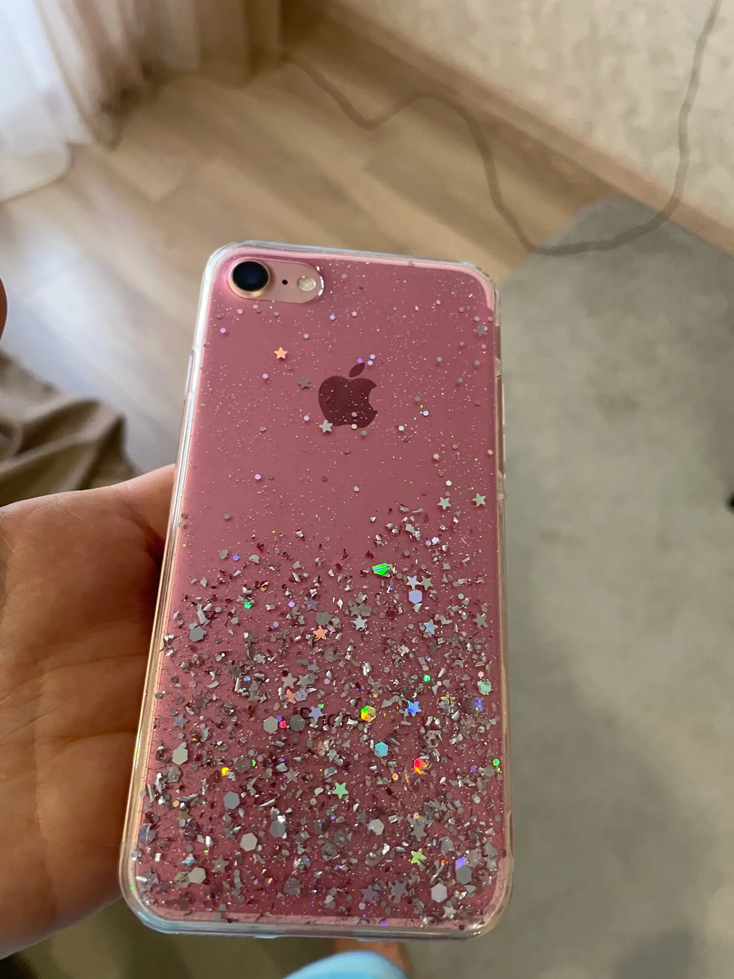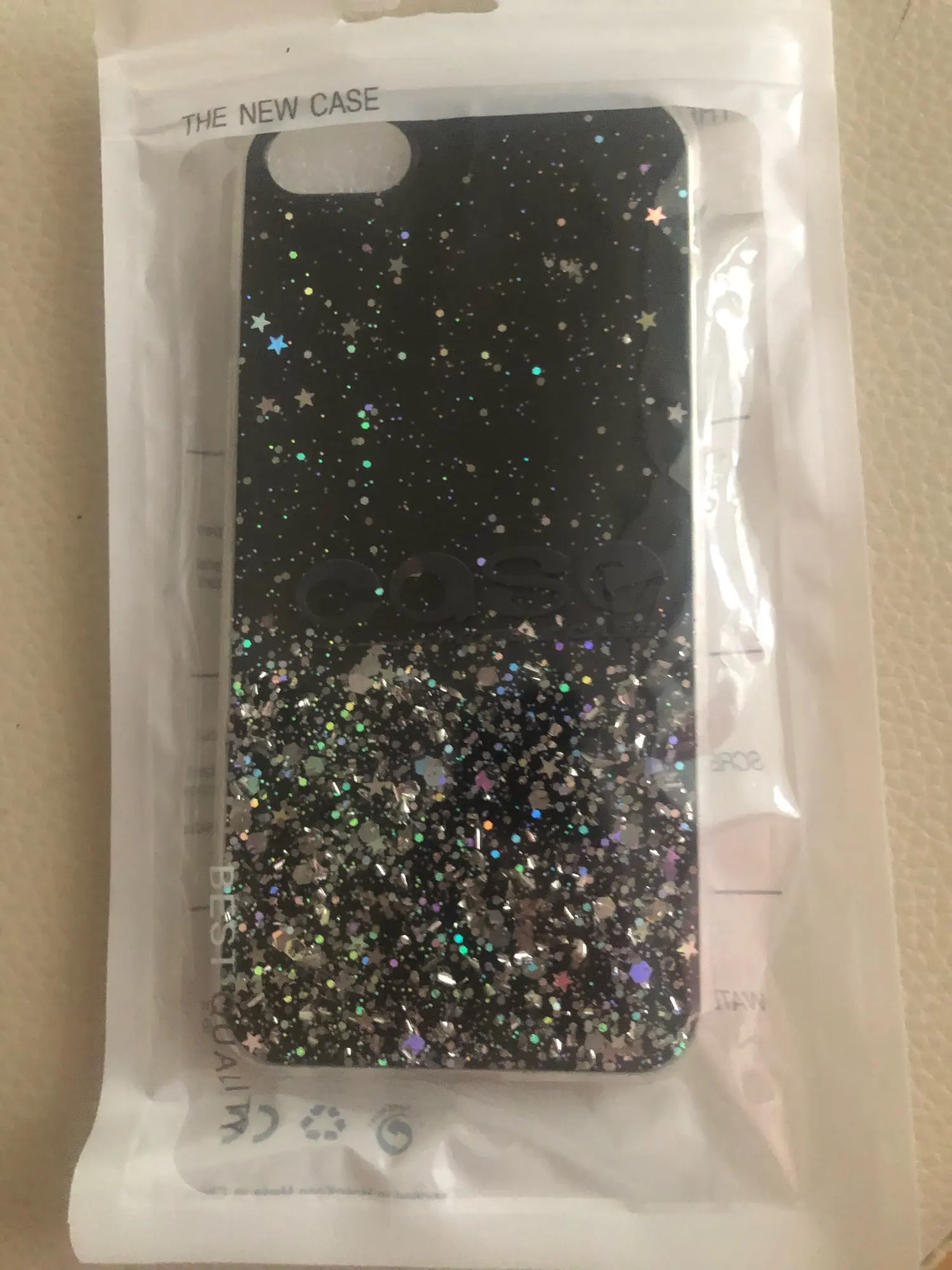 Чехол просто супер!!! Красивый! Подошёл на золотой 6 айфон! Хотя блестки серебристые, но смотрится шикарно! Плотный! Смотрится шикарно!! Пришёл быстро’!!