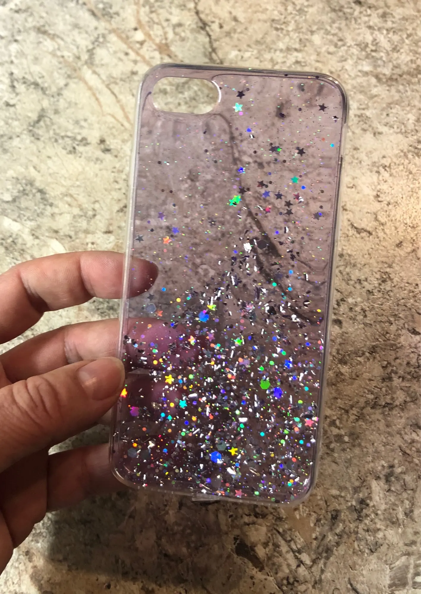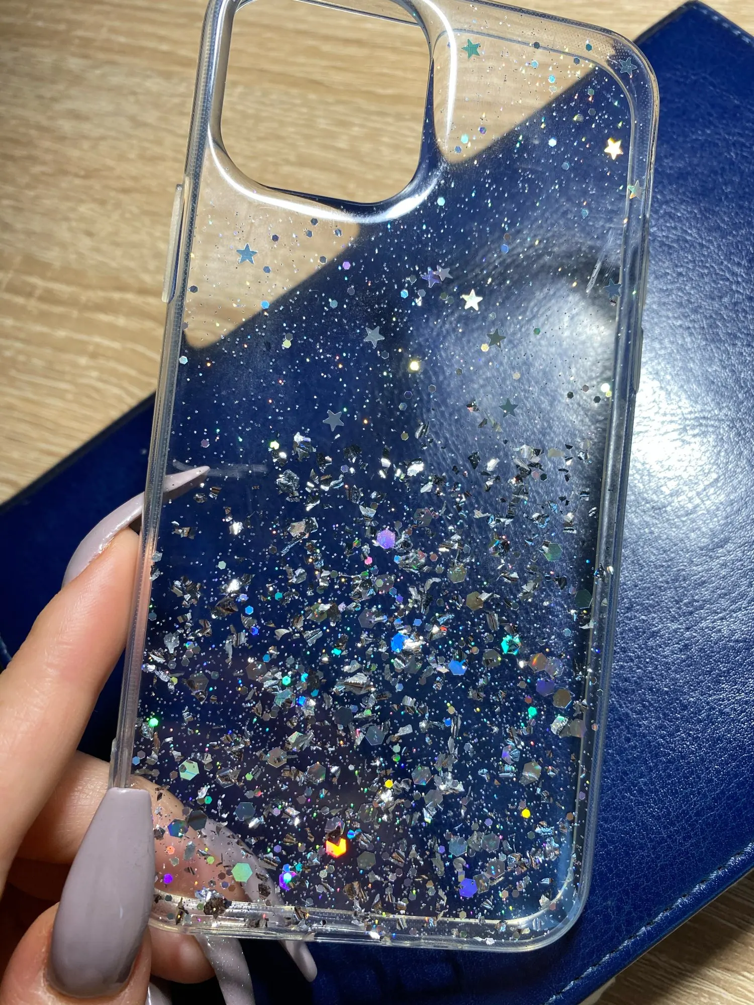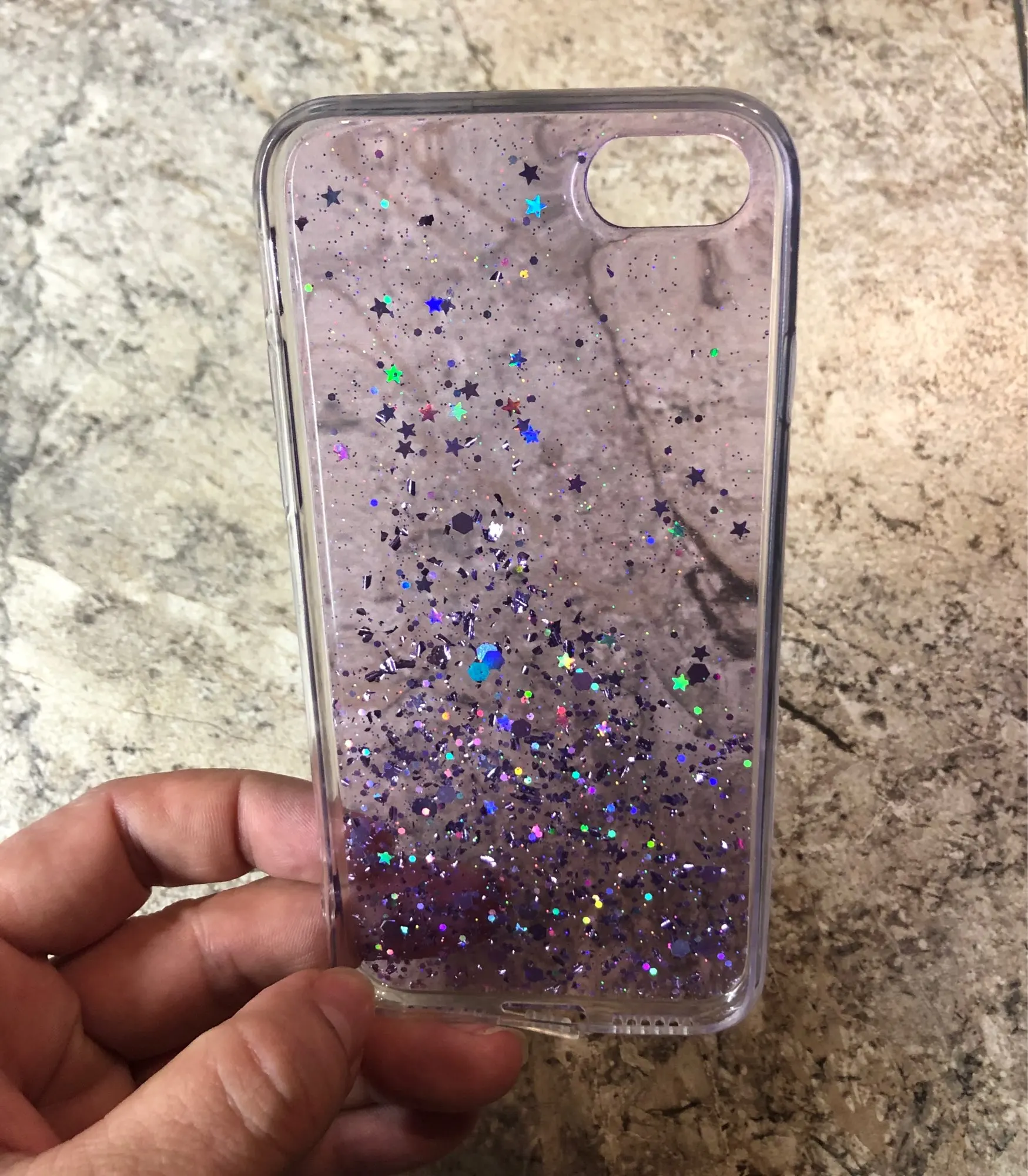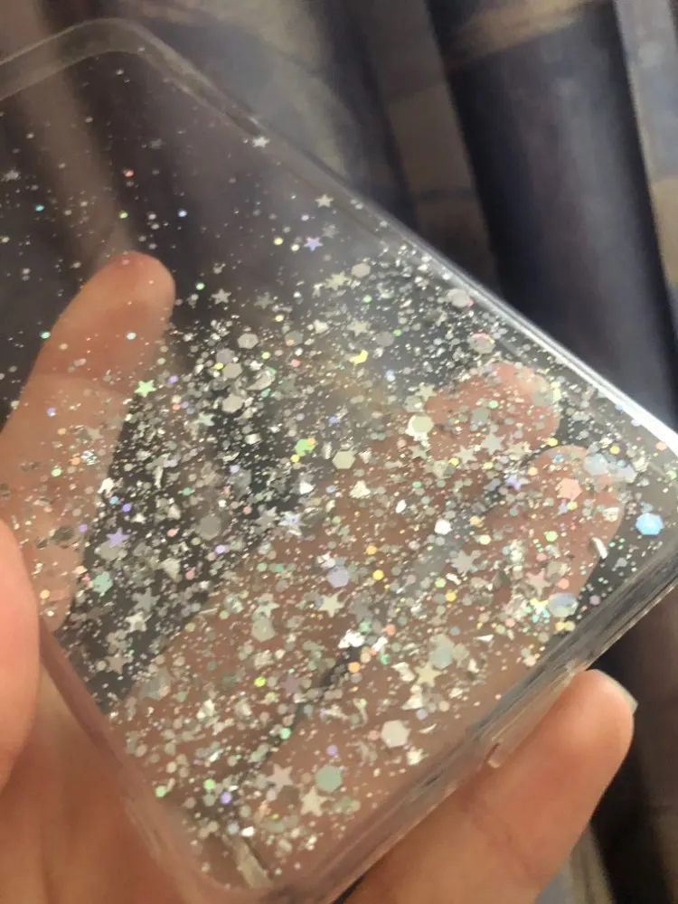 Офигенный чехол, тонкий, звёздочки россыпью очень красиво, объём телефона увеличивает незначительно. Жидкости внутри нет! Блёстки очень яркие, распределены красиво, я очень довольна