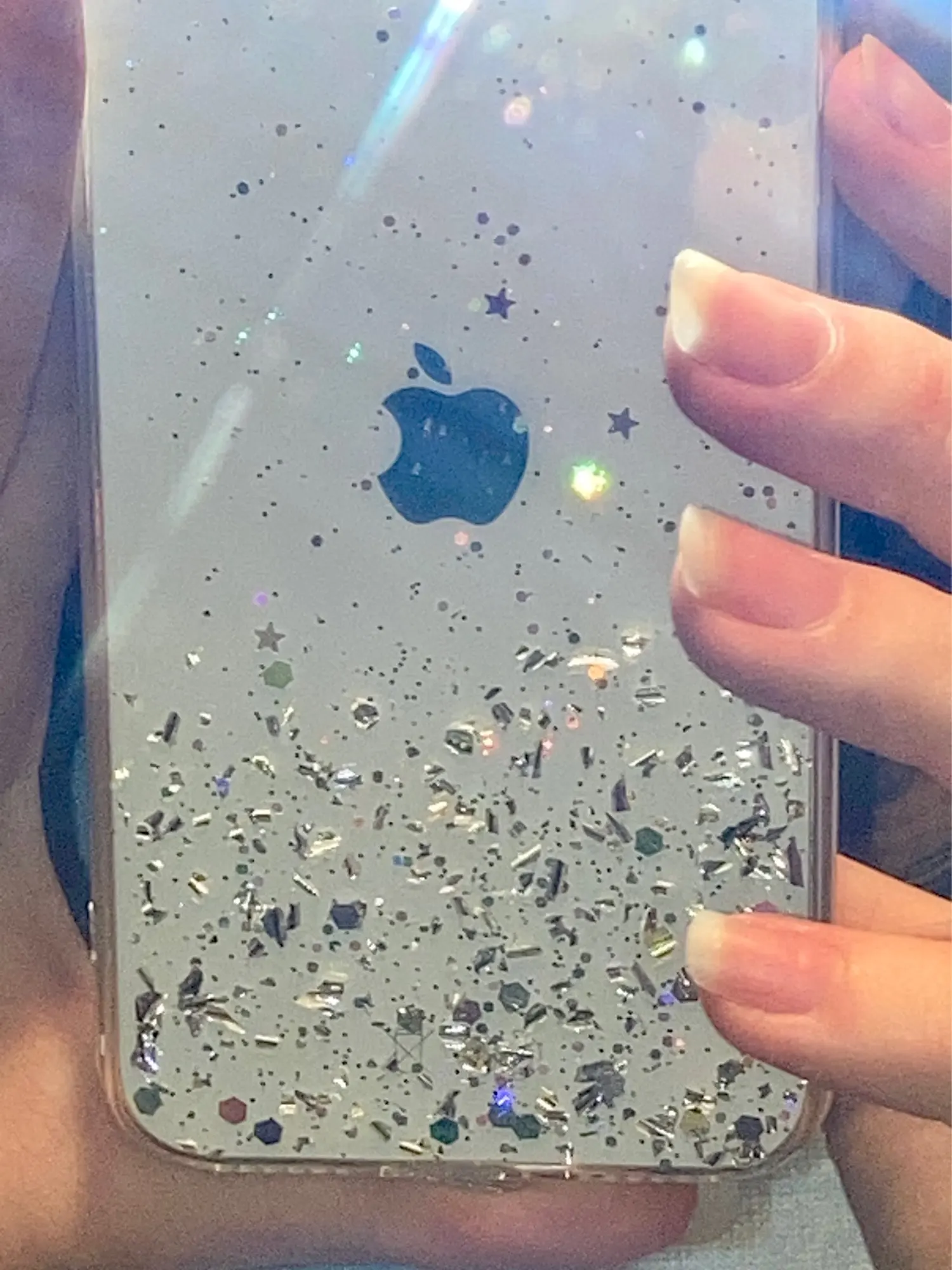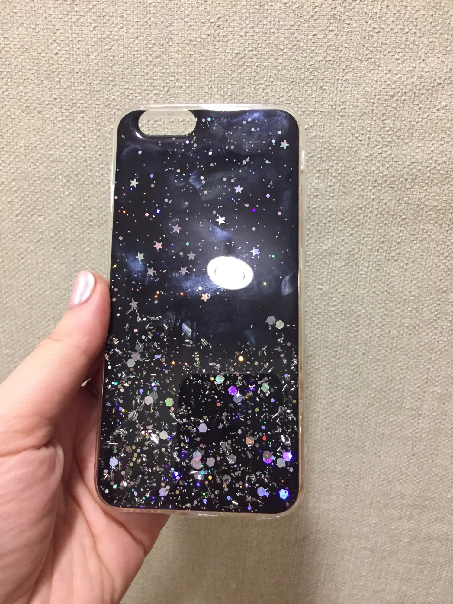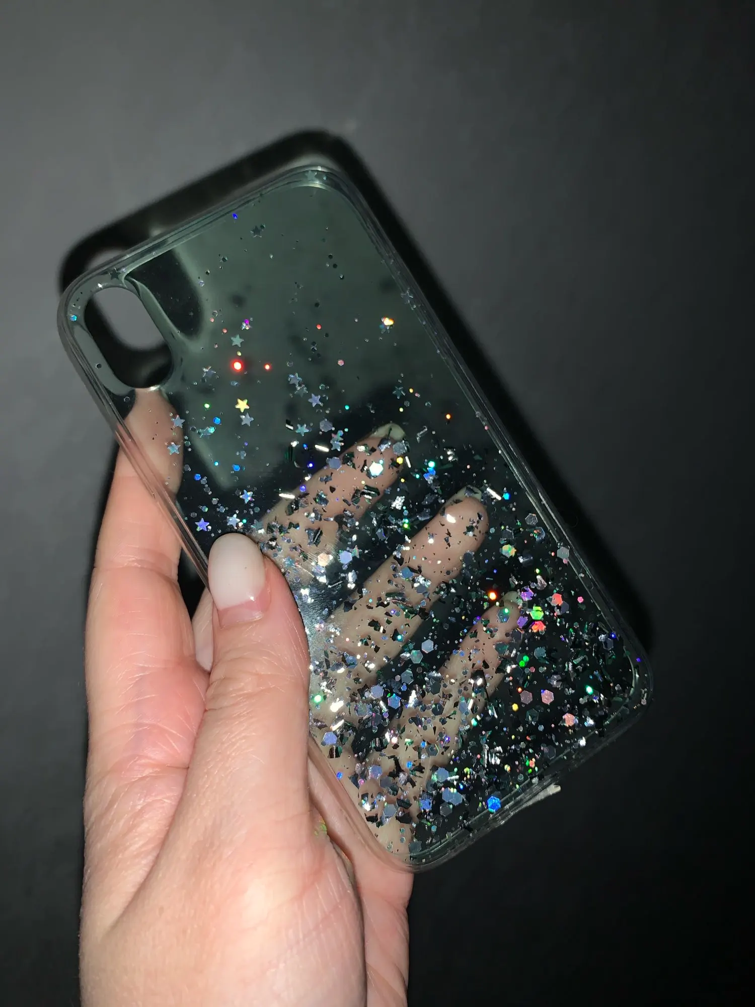 Офигенный чехол, тонкий, звёздочки россыпью очень красиво, объём телефона увеличивает незначительно. Жидкости внутри нет! Блёстки очень яркие, распределены красиво, я очень довольна