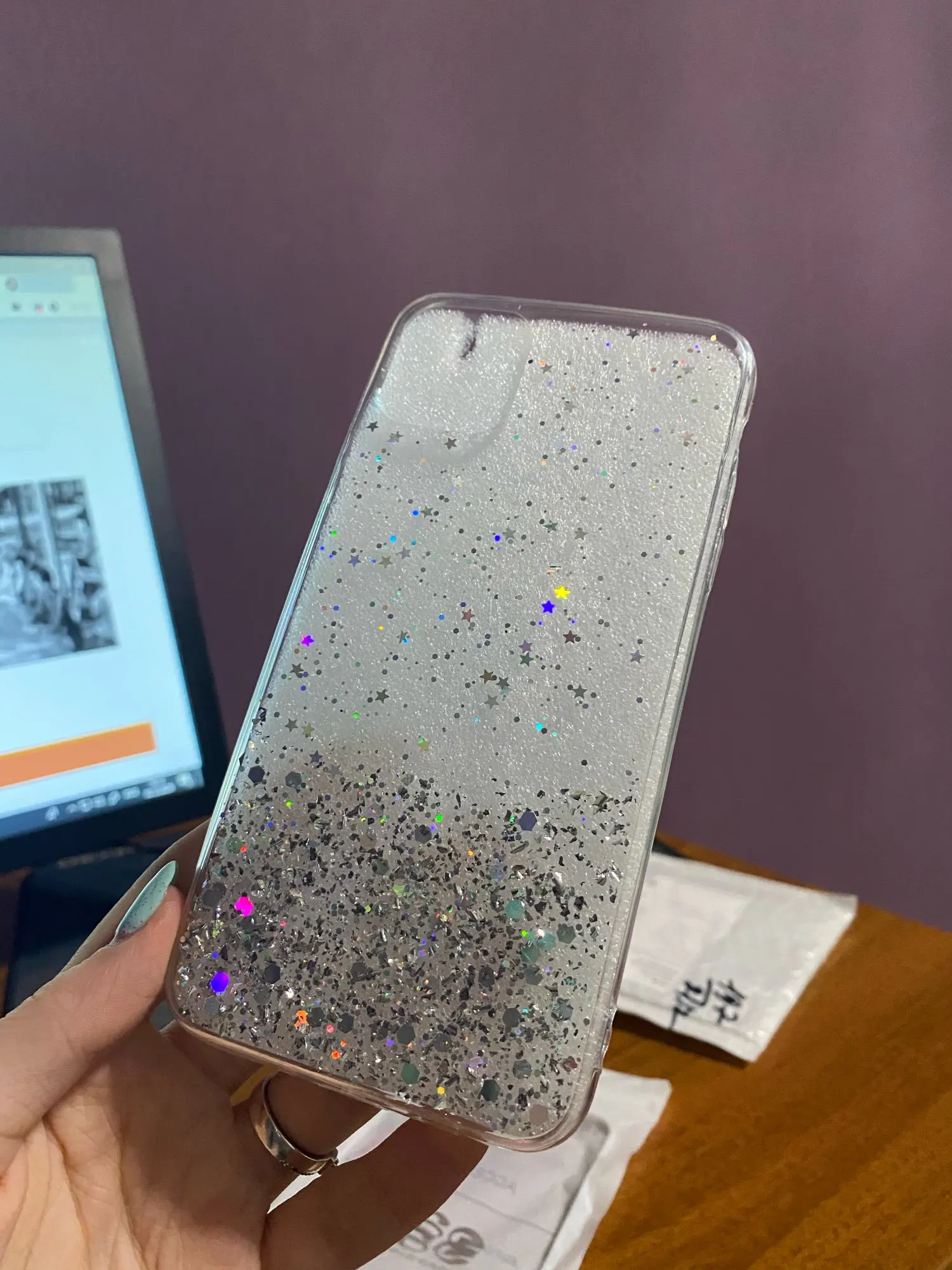 Чехол мягкий, очень приятный на ощупь. Дизайн как и хотелось. Блёстки разноцветные, не пересыпаются. Смотрится отлично. Полностью соответствует описанию. Доставлен в заявленные сроки. С продавцом не общалась. Чехол рекомендую.