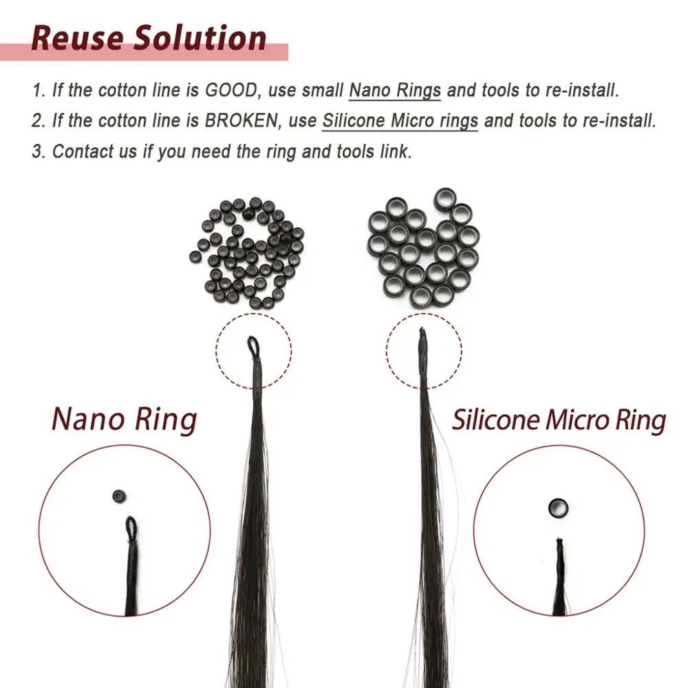1. Если хлопковая линия хорошая, используйте небольшие нано-кольца и инструменты для повторной установки. 2. Если хлопковая леска повреждена, используйте силиконовые микрокольца и инструменты для повторной установки. 3. Свяжитесь с нами, если вам нужна ссылка на кольцо и инструменты.