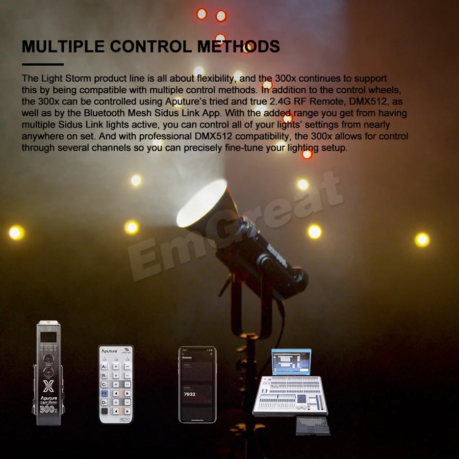 5, (поддержка мульти управления и 9 предварительно запрограммированных световых эффектов): LS 300X поддерживает управление огнями несколькими способами управления, такими как блок управления, пульт дистанционного управления 2,4G RF, DMX 512, А также через приложение Bluetooth Mesh Sidus Link. 300x также запускает с 9 встроенным освещением FX в коробке управления, такие как «Paparazzi» «фейерверк» «молния» «неисправная лампа» «Телевизор» «пульсирующий» «стробоскоп» «взрыв» и «огонь», все с регулируемой цветовой температурой.