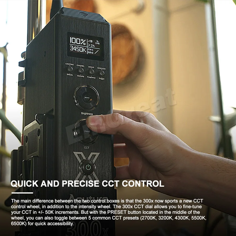 4, (блок управления обновлением с быстрым и точным управлением CCT): LS300X обновил блок управления с новым колесом управления CCT. Циферблат 300x CCT позволяет точно настроить CCT с шагом +/- 50K. Но с заданной кнопкой, расположенной в середине колеса, вы также можете переключаться между 5 обычными CCT предустановками (2700K, 3200K, 4300K, 5500K, 6500K) для быстрого доступа.