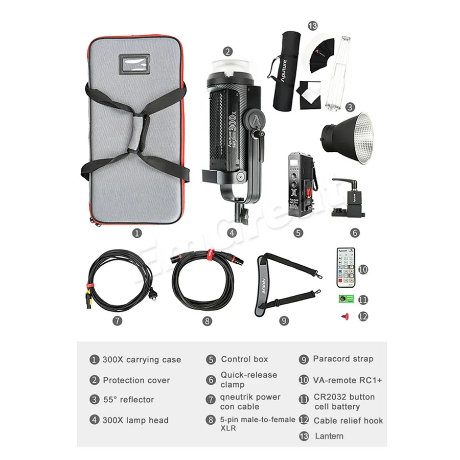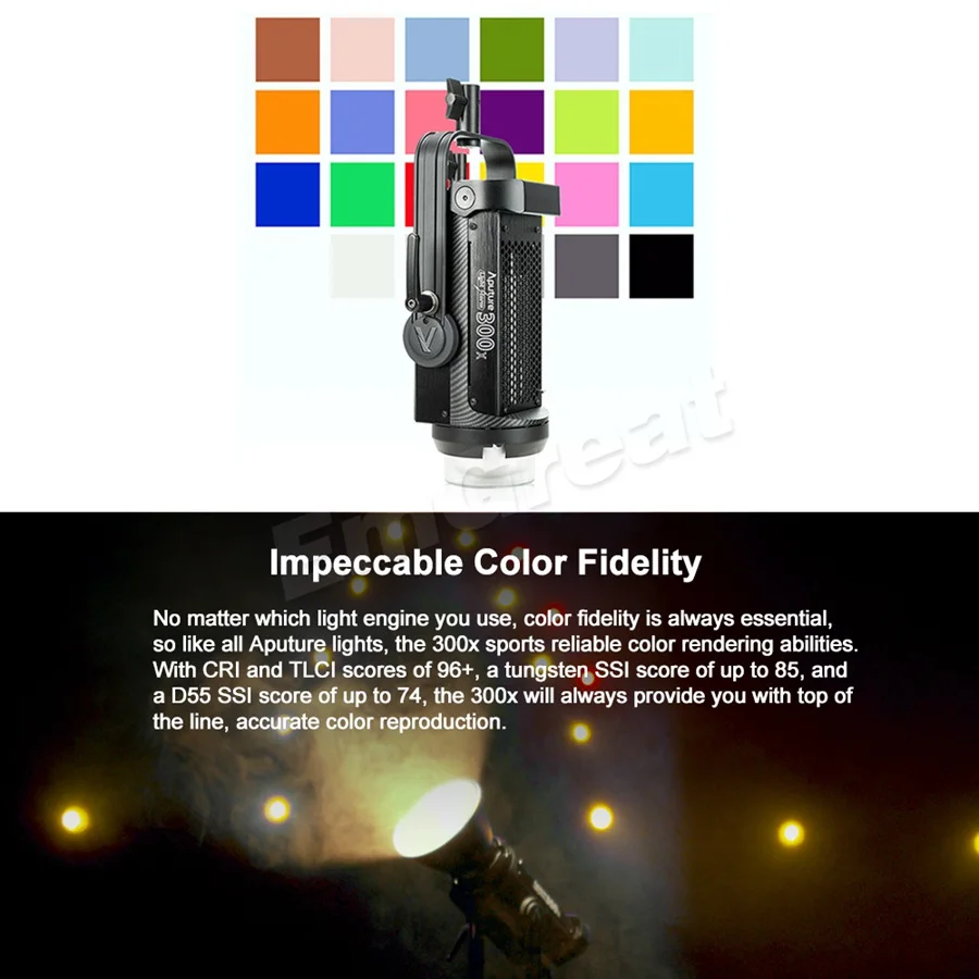 2, (двухцветный 2700K-6500K): 300x является первым из многих ламп Aputure для использования расширенного диапазона vari-white CCT 2700K-6500K, выходя за рамки традиционного двухцветного освещения, позволяя производить свет, который теплее, чем обычные вольфрамовые светильники, и прохладнее, чем обычный Дневной свет (D55).