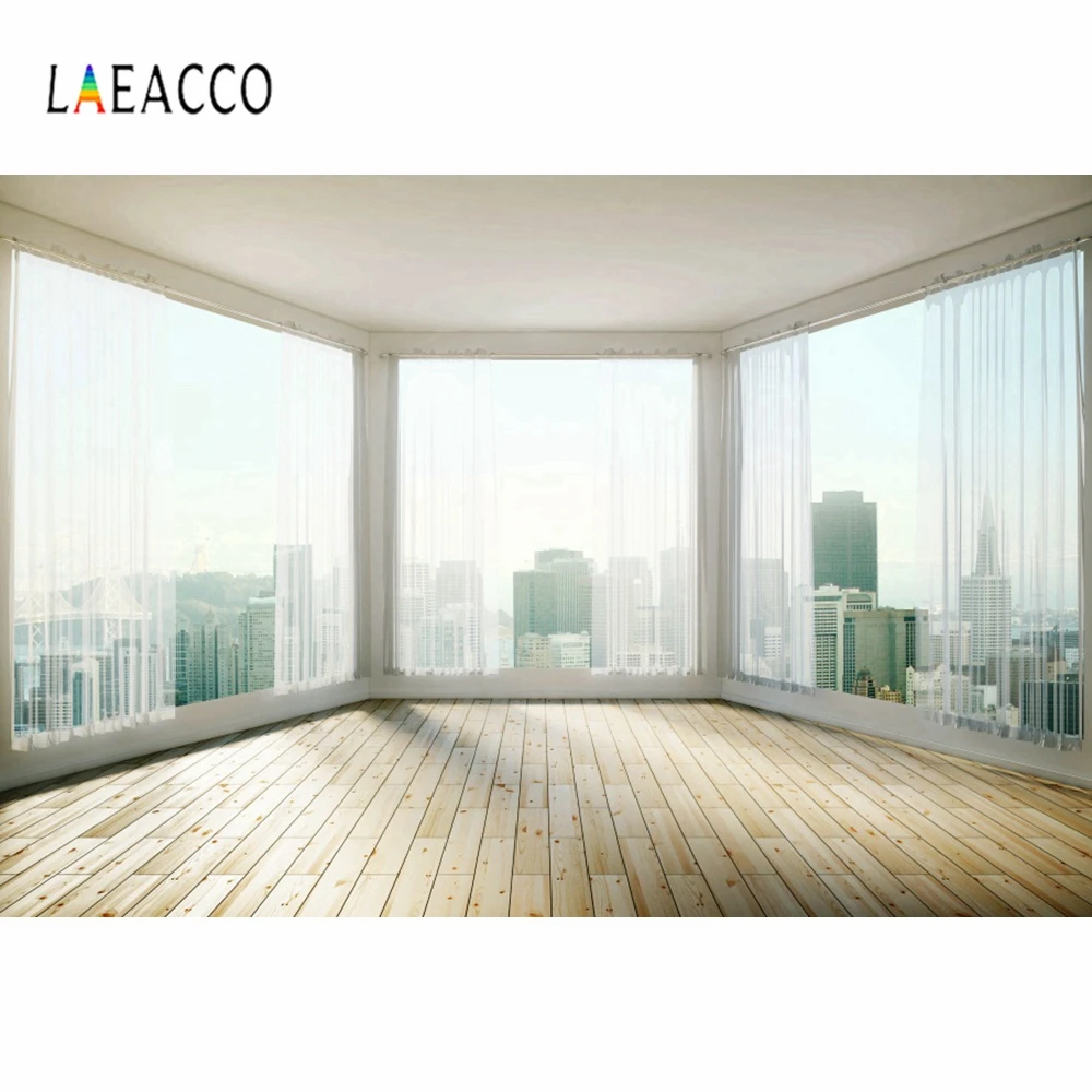 Laeacco Интерьерная сцена французское окно деревянный пол вид на город фон для портретного декора Виниловый фон для фотосъемки Фотостудия