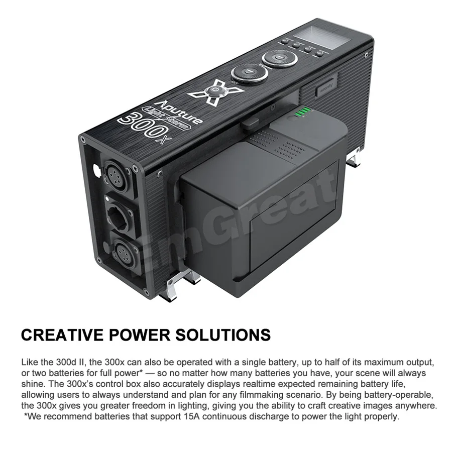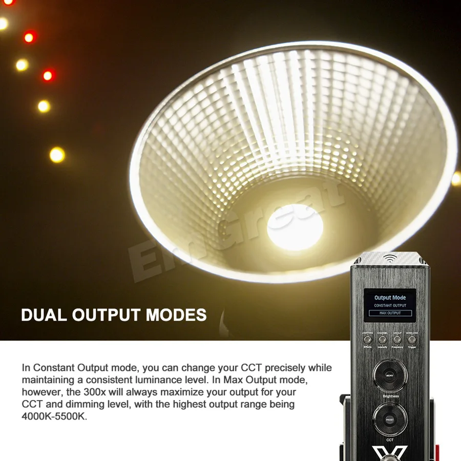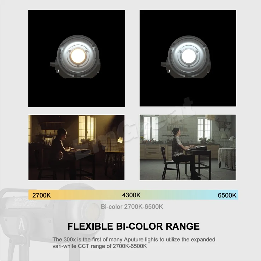 2, (двухцветный 2700K-6500K): 300x является первым из многих Aputure светильник s для использования расширенного диапазона vari-white CCT 2700K-6500K, выходя за рамки традиционного двухцветного, позволяя производить светильник, который теплее, чем обычные вольфрамовые светильники, и прохладнее, чем обычный Дневной светильник (D55).