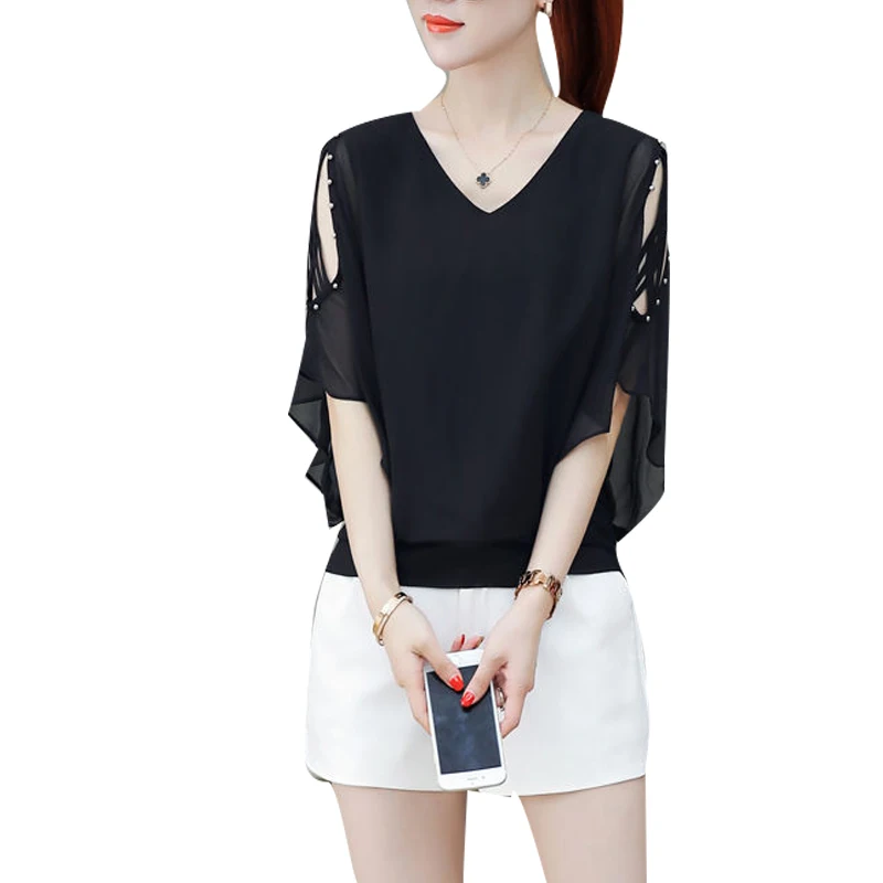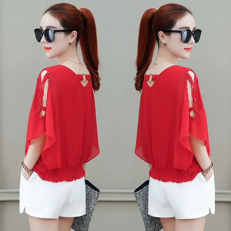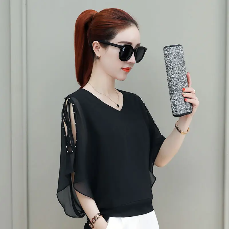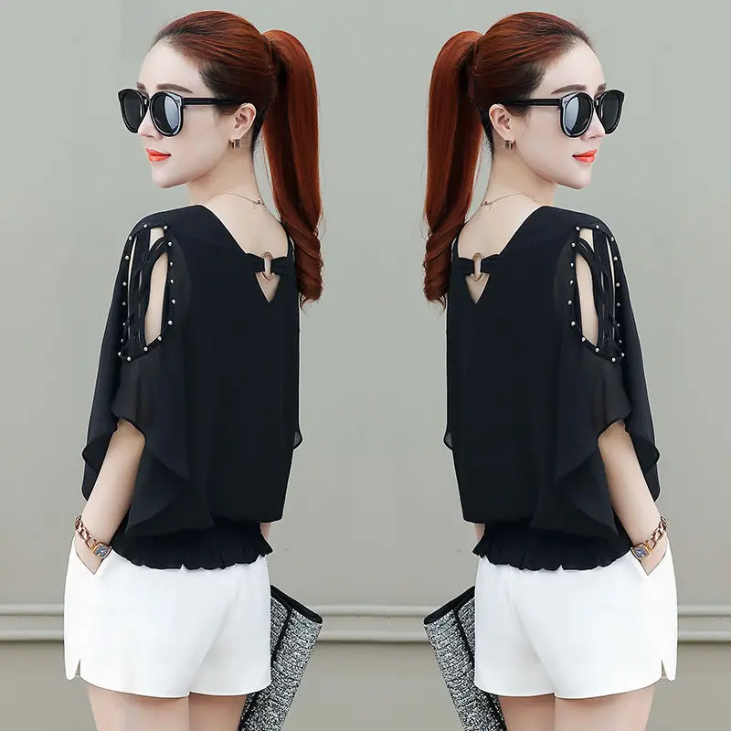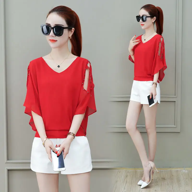 Женская шифоновая блузка, однотонная, с V-образным вырезом и коротким рукавом, с открытыми плечами, весна-лето, DD8610