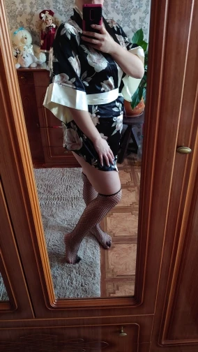 Одна сторона очень короткая. Видно буквально все. В комплекте в халатом имеются чулки и трусики. Это плюс. Если не считать того, что он сильно короткий, то в целом все отлично