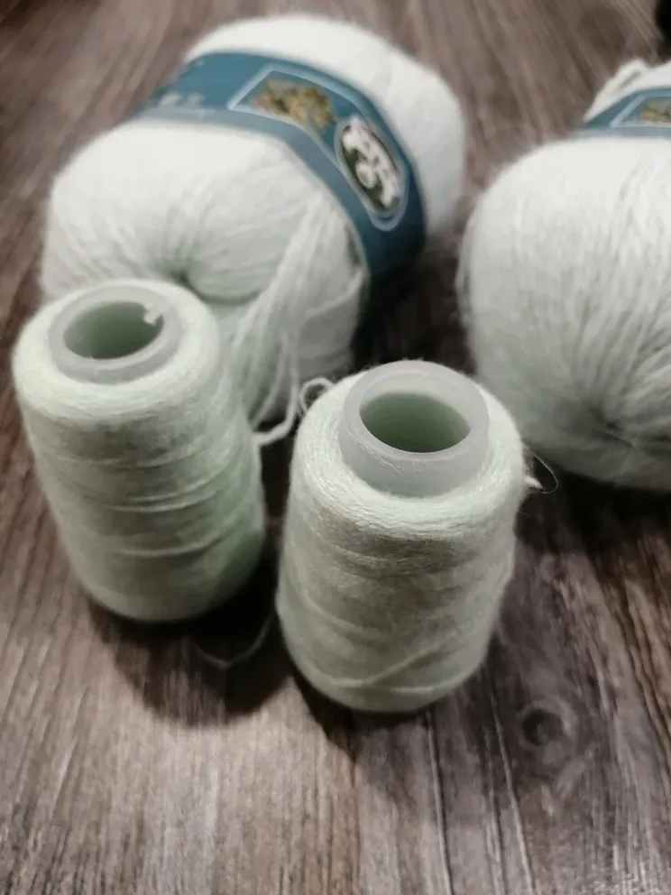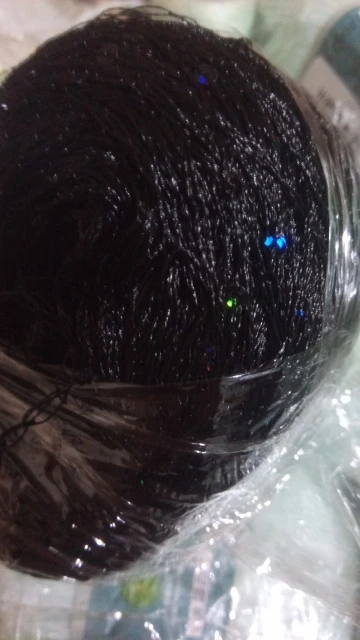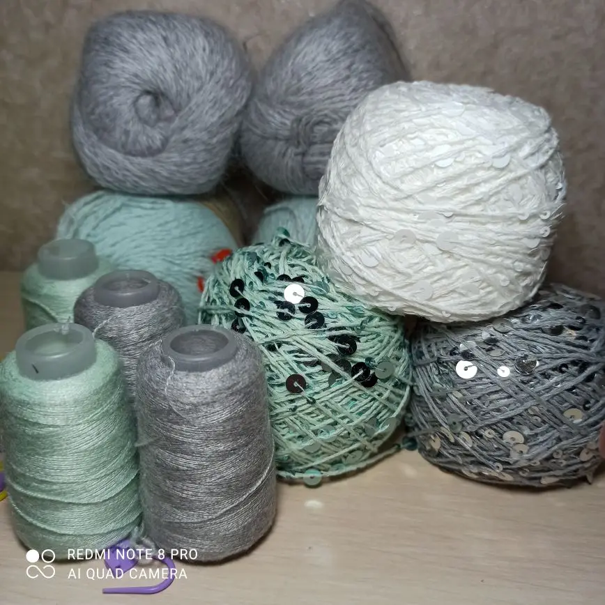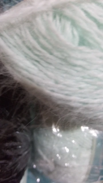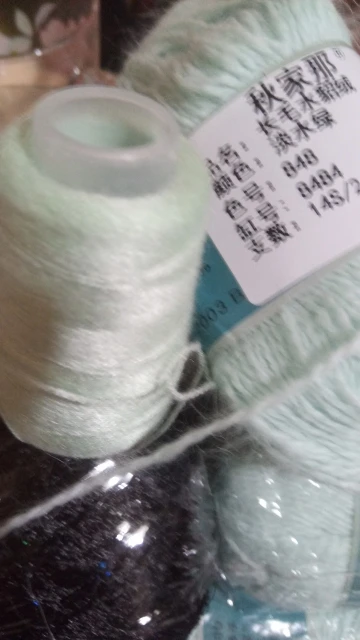 Пряжа пушистик, цвет мята (телефон не передаёт цвет) цвет 848. Всё хорошо, мне нравится выписывала у разных продавцов, здесь очень красивый цвет думаю и качество продукции должно соответствовать. Будем вязать если всё хорошо буду выписывать ещё. Насчёт чёрной нитки с пакетами вообще прелесть на фото видно как переливаются паетки разным цветом. Красота.