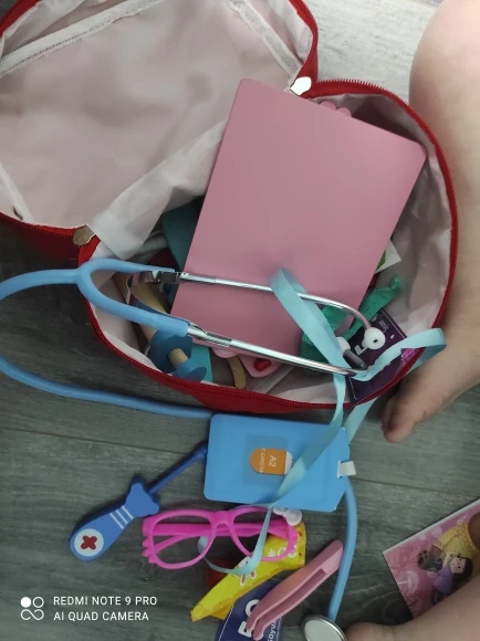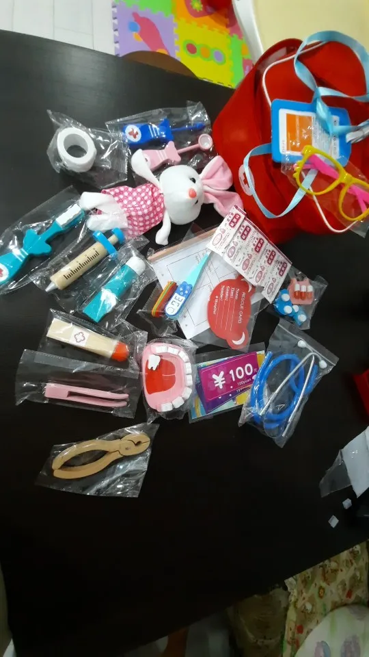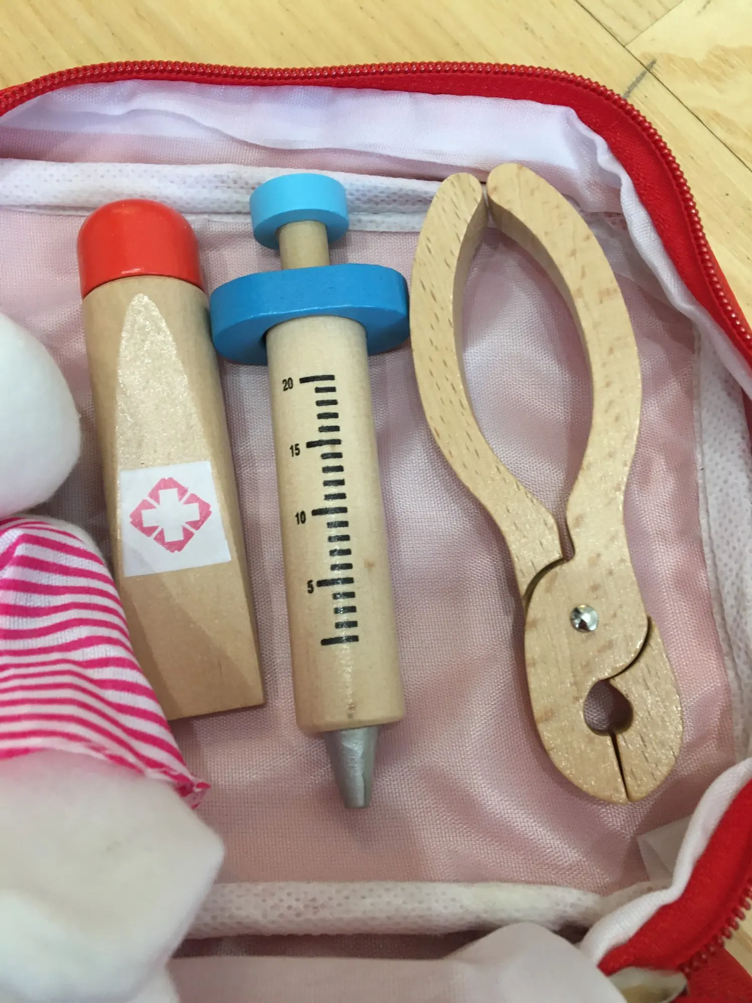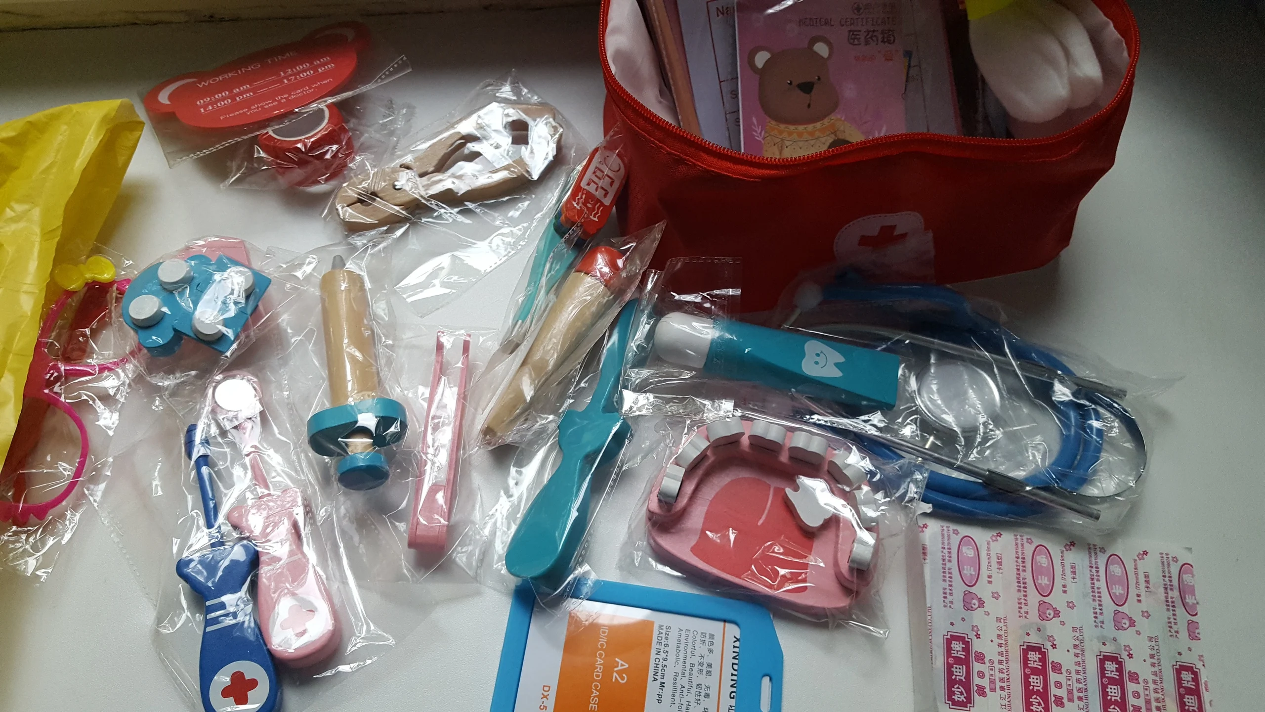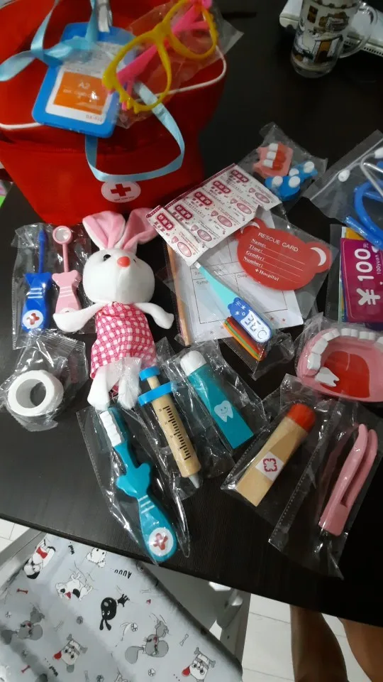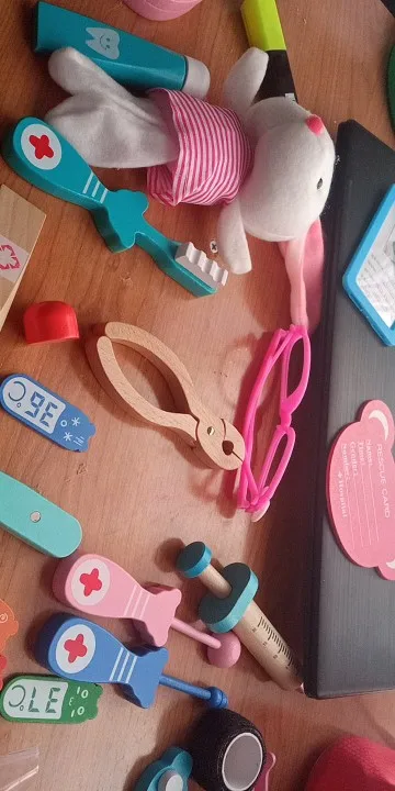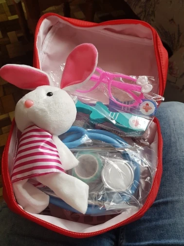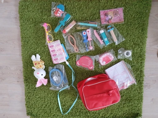 Посылка шла очень долго. И продавец неразговорчивый. Но ребёнок очень доволен игрушкой. Если поподробнее... Тюбики соединяются с крышечкой магнитом. Шприц надавливается и отскакивает - на пружинке. Зеркало стоматологическое для зубов будто бы не настоящее. А вот стетоскоп для прослушивания тела - настоящий. Есть в наборе тонкие бумажки - деньги - и буклет с услугами + временем приема докторов, но, увы, там всё на китайском. Пластыри клеющиеся - настоящие. Есть запасной +1 зуб. Очень порадовал градусник со съемными пластинами для разной температуры тела. Он с изображением эмоций - мордочек. В нашем наборе таблетки слитные.. мне бы хотелось, да и ребёнку было бы интереснее, чтобы они были по отдельности - не приклеены - как зубы, например. Есть очки. Они из пластика. Было бы круто, если бы тоже из дерева. Единственное, что прям огорчило: зайка пришёл плохого качества, видны нитки на платье и под платьем. Пришёл без носа. И вшитые уши просвечивают под лбом - выглядит странно.