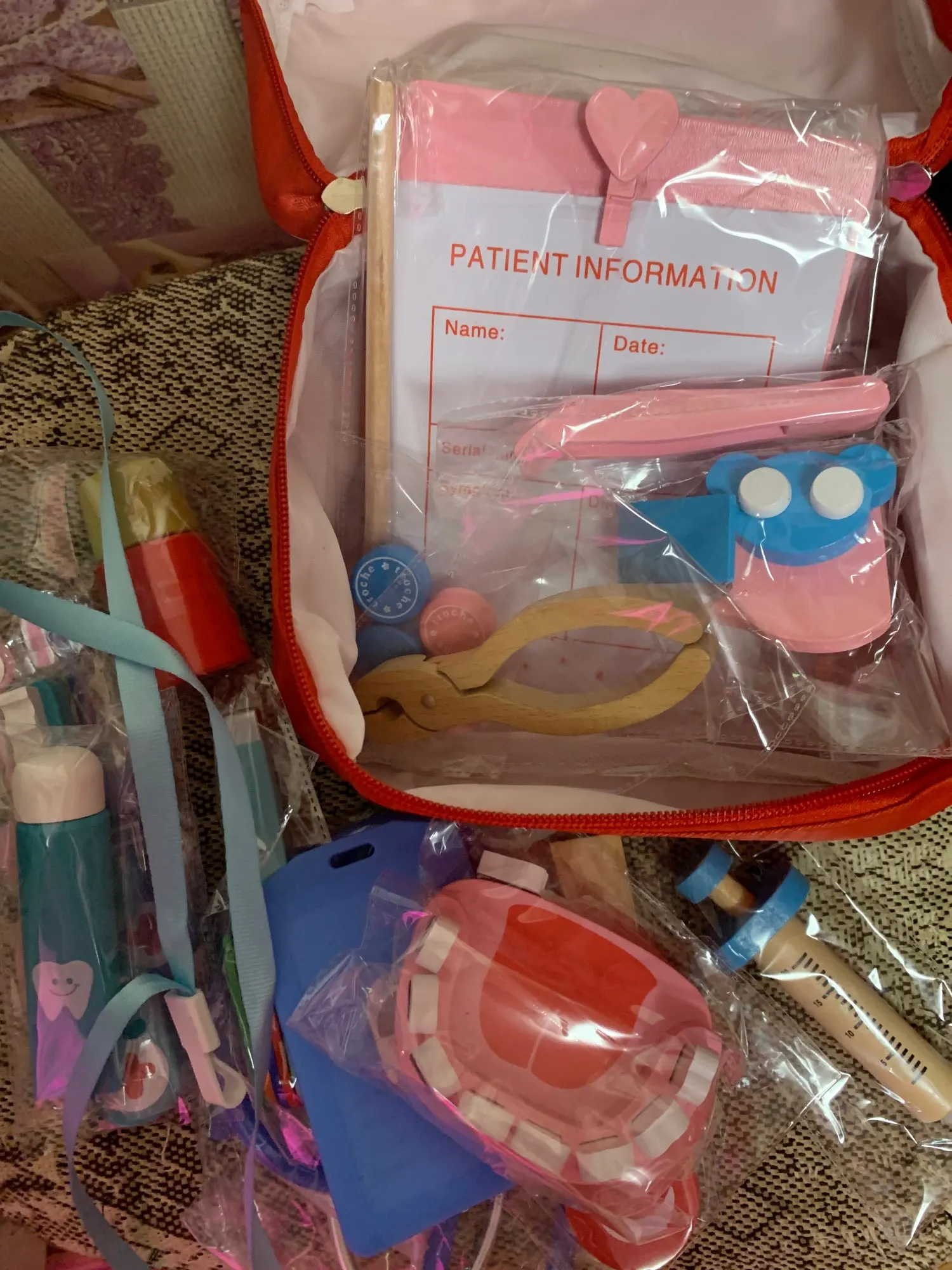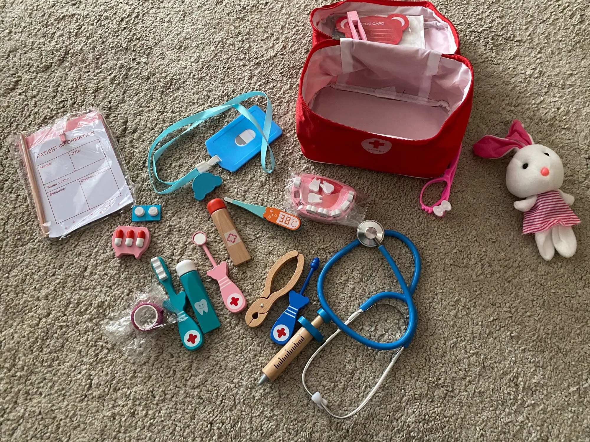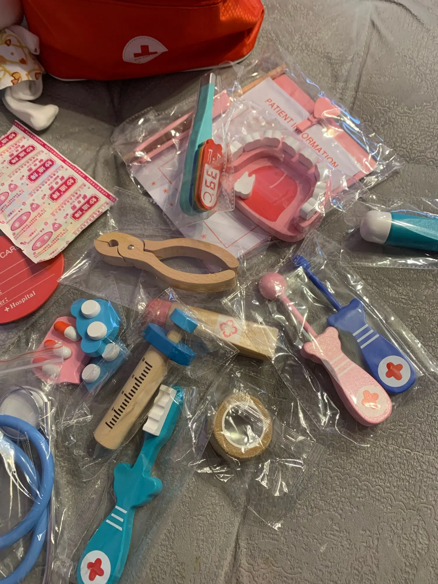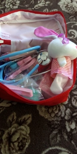 Посылка шла очень долго. И продавец неразговорчивый. Но ребёнок очень доволен игрушкой. Если поподробнее... Тюбики соединяются с крышечкой магнитом. Шприц надавливается и отскакивает - на пружинке. Зеркало стоматологическое для зубов будто бы не настоящее. А вот стетоскоп для прослушивания тела - настоящий. Есть в наборе тонкие бумажки - деньги - и буклет с услугами + временем приема докторов, но, увы, там всё на китайском. Пластыри клеющиеся - настоящие. Есть запасной +1 зуб. Очень порадовал градусник со съемными пластинами для разной температуры тела. Он с изображением эмоций - мордочек. В нашем наборе таблетки слитные.. мне бы хотелось, да и ребёнку было бы интереснее, чтобы они были по отдельности - не приклеены - как зубы, например. Есть очки. Они из пластика. Было бы круто, если бы тоже из дерева. Единственное, что прям огорчило: зайка пришёл плохого качества, видны нитки на платье и под платьем. Пришёл без носа. И вшитые уши просвечивают под лбом - выглядит странно.