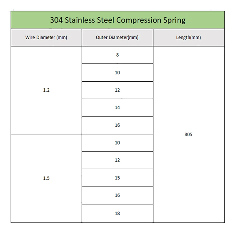 Материал: нержавеющая сталь 304Размер: диаметр проволоки x Внешний диаметр x длинаНапример: 1,2x8x305 мм означает диаметр проволоки = 1,2 мм, внешний диаметр = 8 мм, длина = 305 ммДиаметр проволоки: 1,2/1,5 ммВнешний диаметр: 8-18 ммДлина: 305 ммХарактеристики продукта: гладкая поверхность, равномерное расстояние, равномерное усилие, стабильный отскок, хорошая гибкость