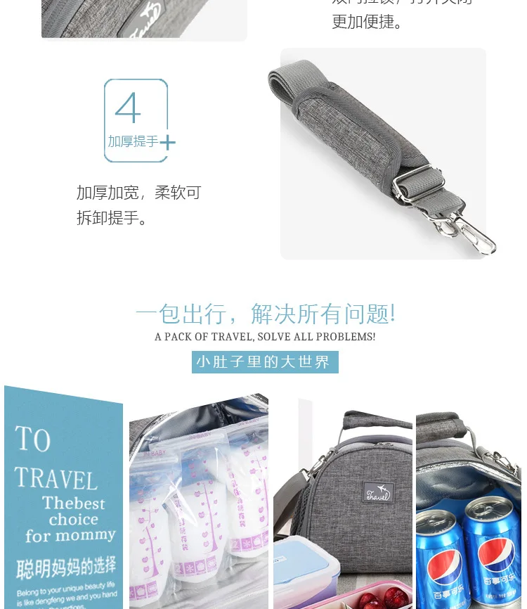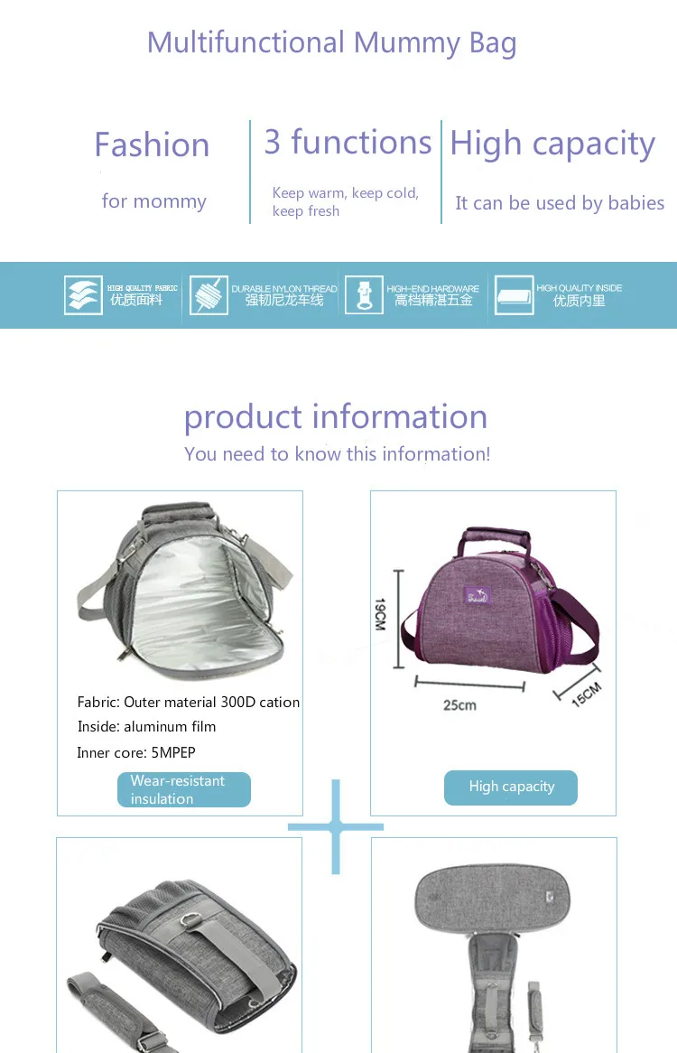 Ткань: внешний материал 3000 катионныйВнутри: алюминиевая пленкаВнутренний сердечник: 5 ммРазмер: 25*15*19 смСупер большая многофункциональная сумка для мам, суперсохраняющий тепло эффект, складное хранение, разворачивается, не оставляя следов, легко моется, длительное сохранение тепла и легко переносится. Двусторонняя молния, открывание и закрытие, более удобная.