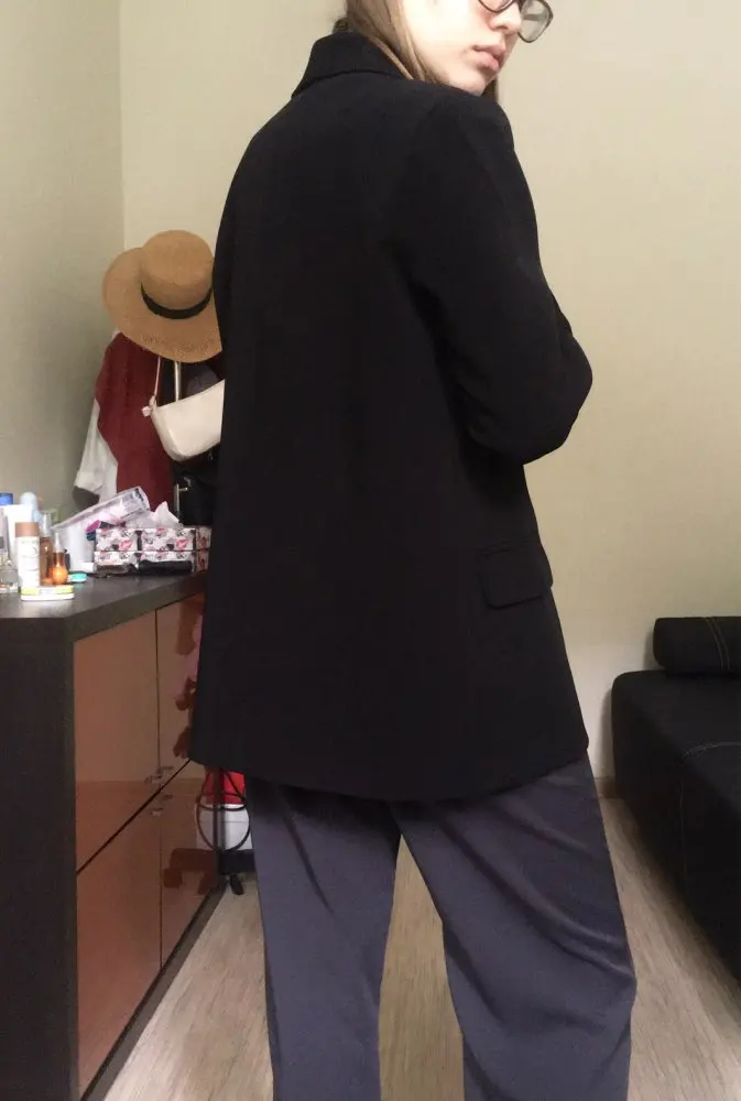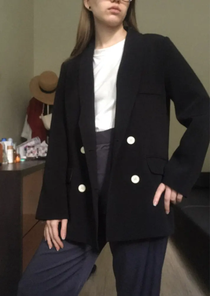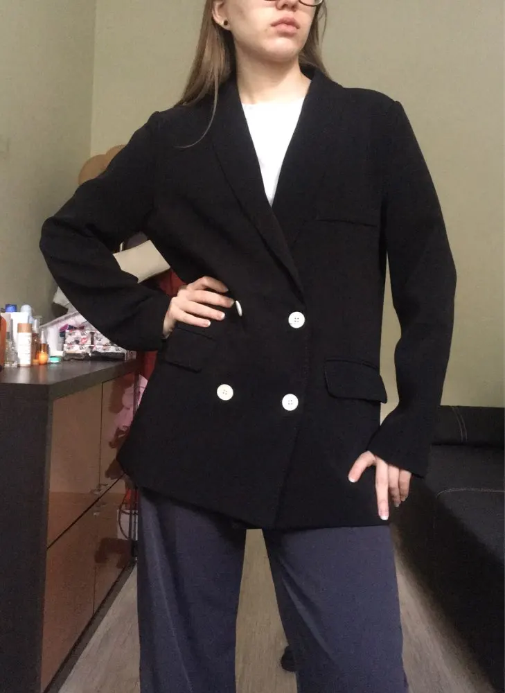 Пиджак прибыл за 20 дней в пакете с другими посылками. Дали обновлённый код отслеживания. Пиджак очень понравился. Определённо стоит своих денег. На мои параметры (рост 162, ОГ 80, ОТ 62, ОБ 90) сел как и хотела: оверсайз, но не утонула как это часто бывает. Пиджак сшит качественно, материал плотный, форму держит. Покупкой очень довольна!
