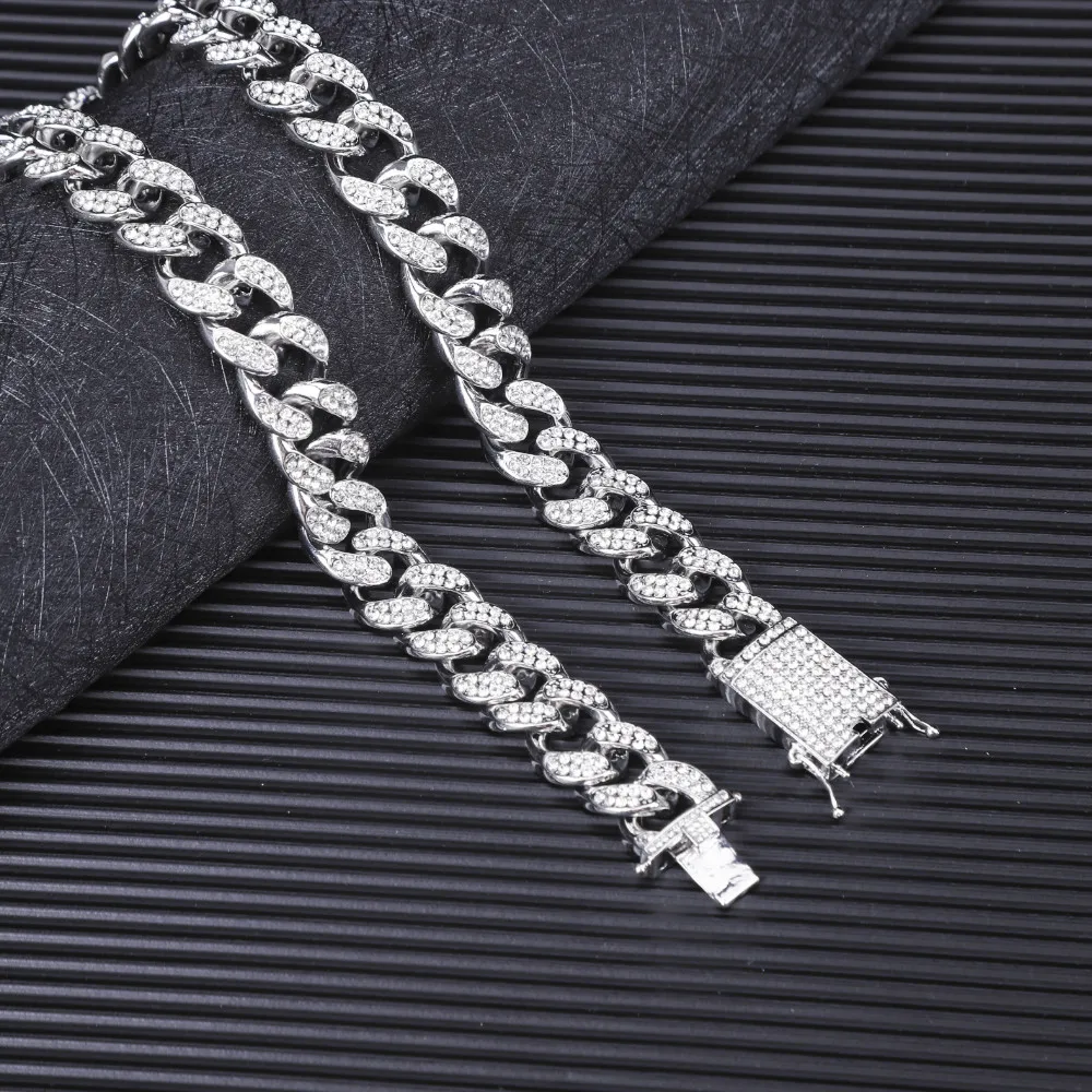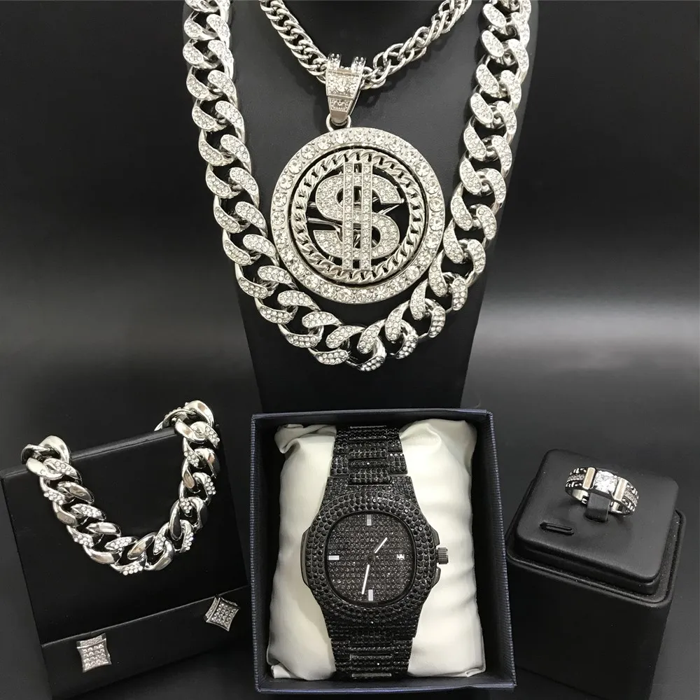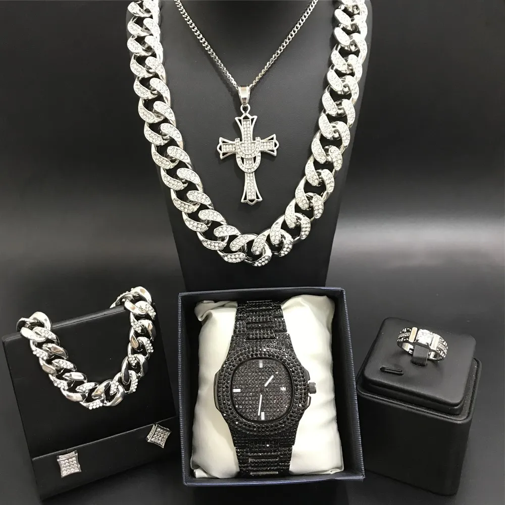 Роскошные мужские серебряные часы, ожерелье, браслет, кольцо и серьги комбинированные хип-хоп кристалл Майами Цепочка-Ожерелье для мужчин