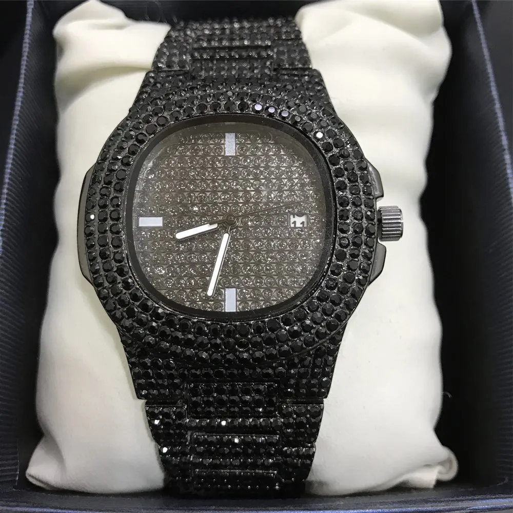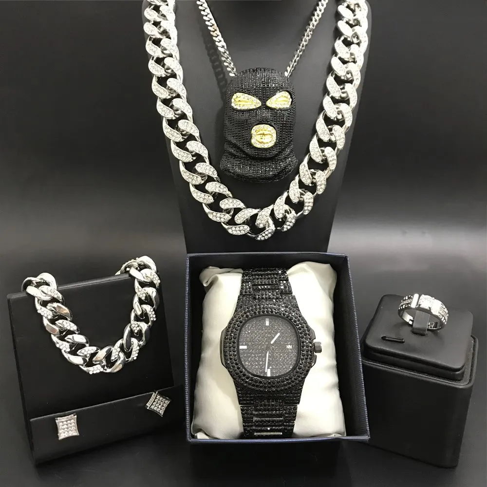 Роскошные мужские часы серебряного цвета, ожерелье, браслет, кольцо и серьги, комбинированные часы в стиле хип-хоп, ювелирные изделия-ожерелье для мужчин
