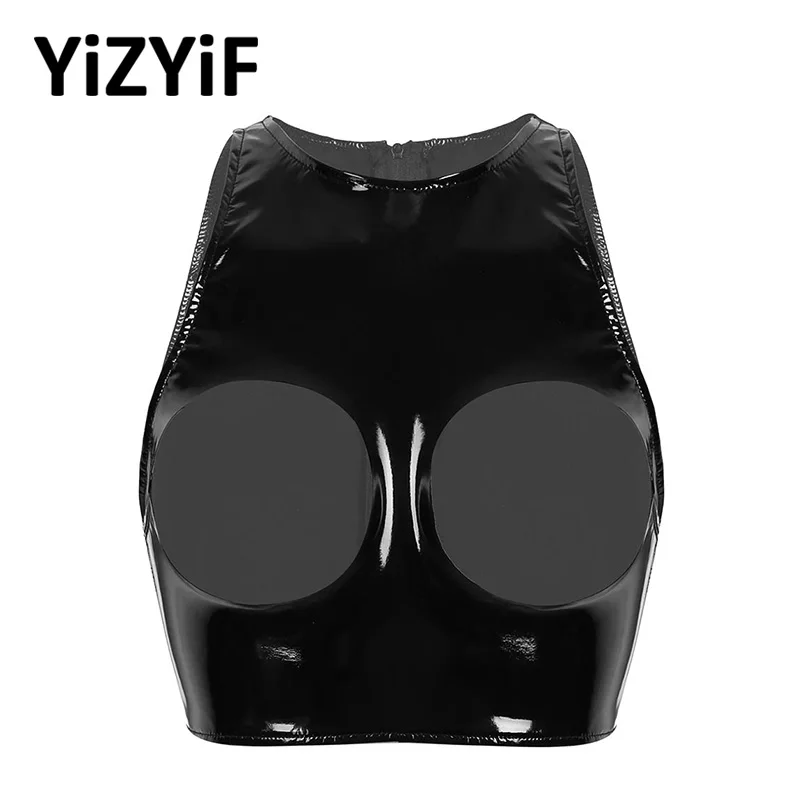 Женский экзотический бюстгальтер с открытой чашкой, сексуальные майки из искусственной кожи без рукавов, открытый бюст, ажурные Короткие жилеты, топы, майки топы