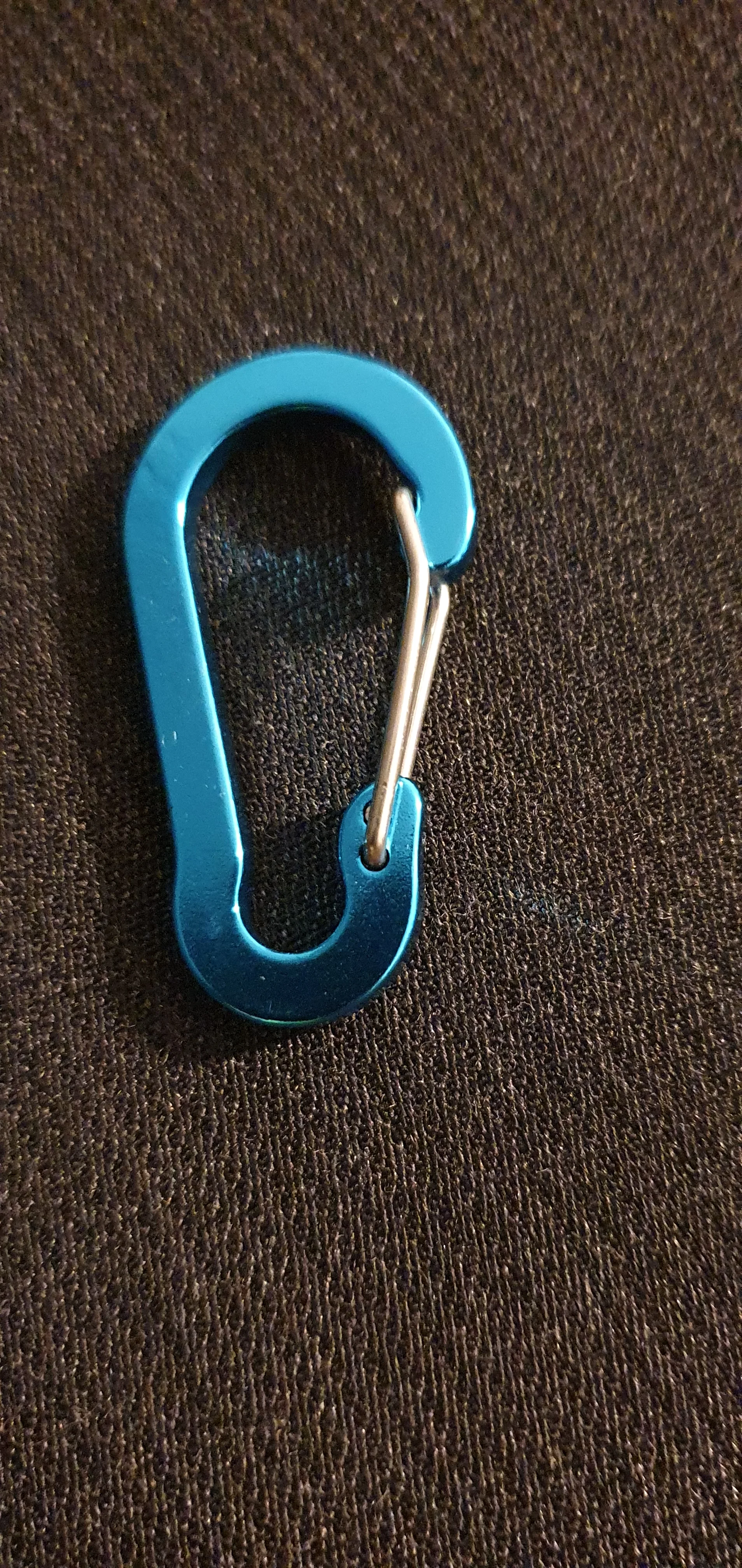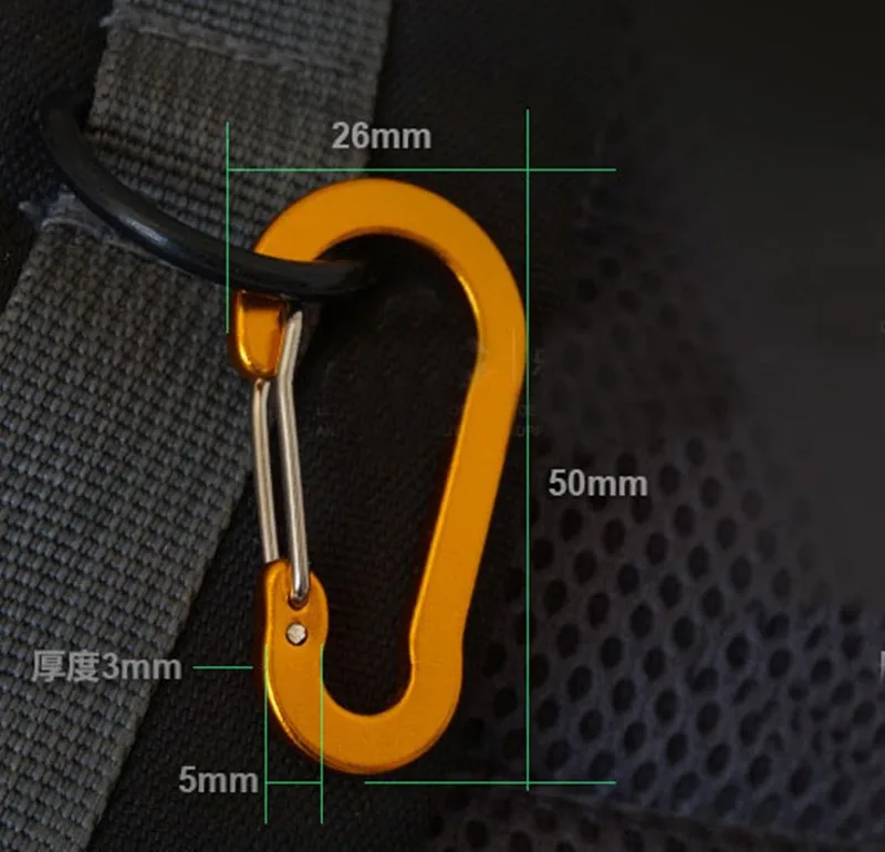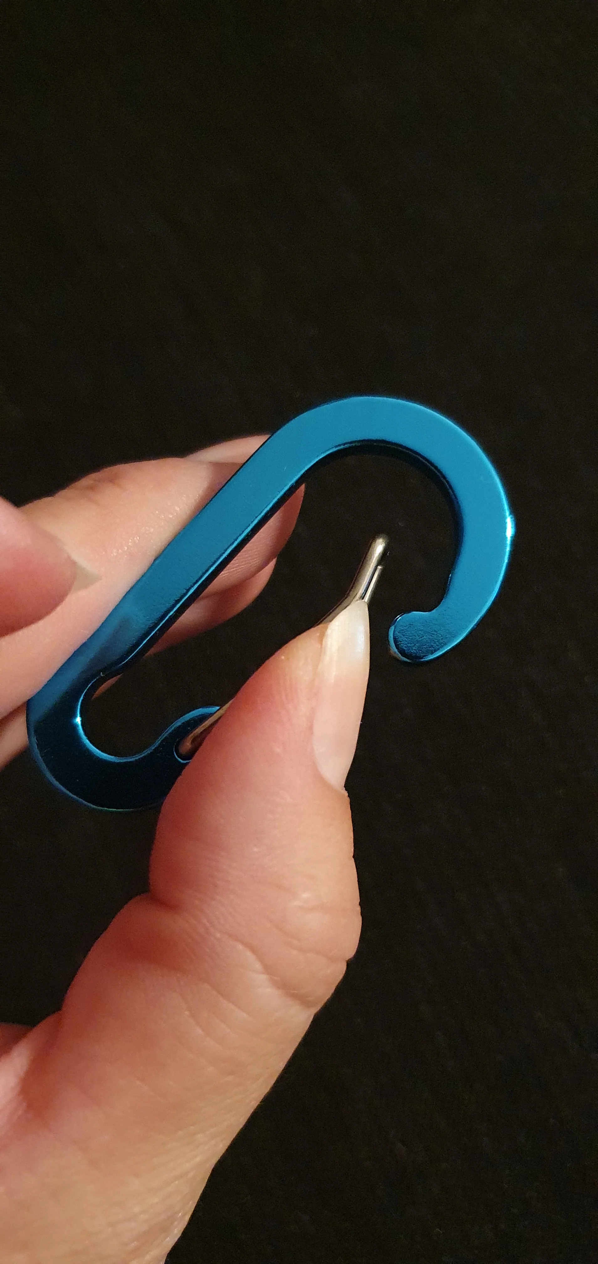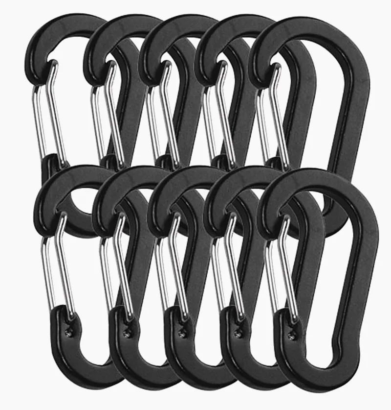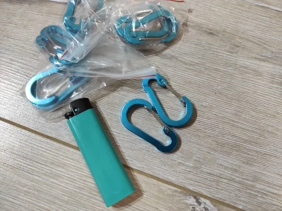 Маленькие карабины. Хорошо продуманный, прочный для размера (он должен держать 10-20 кг, я думаю).