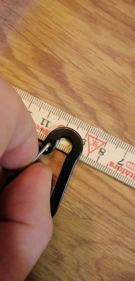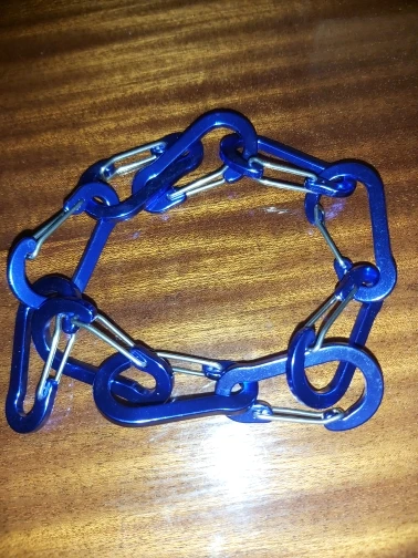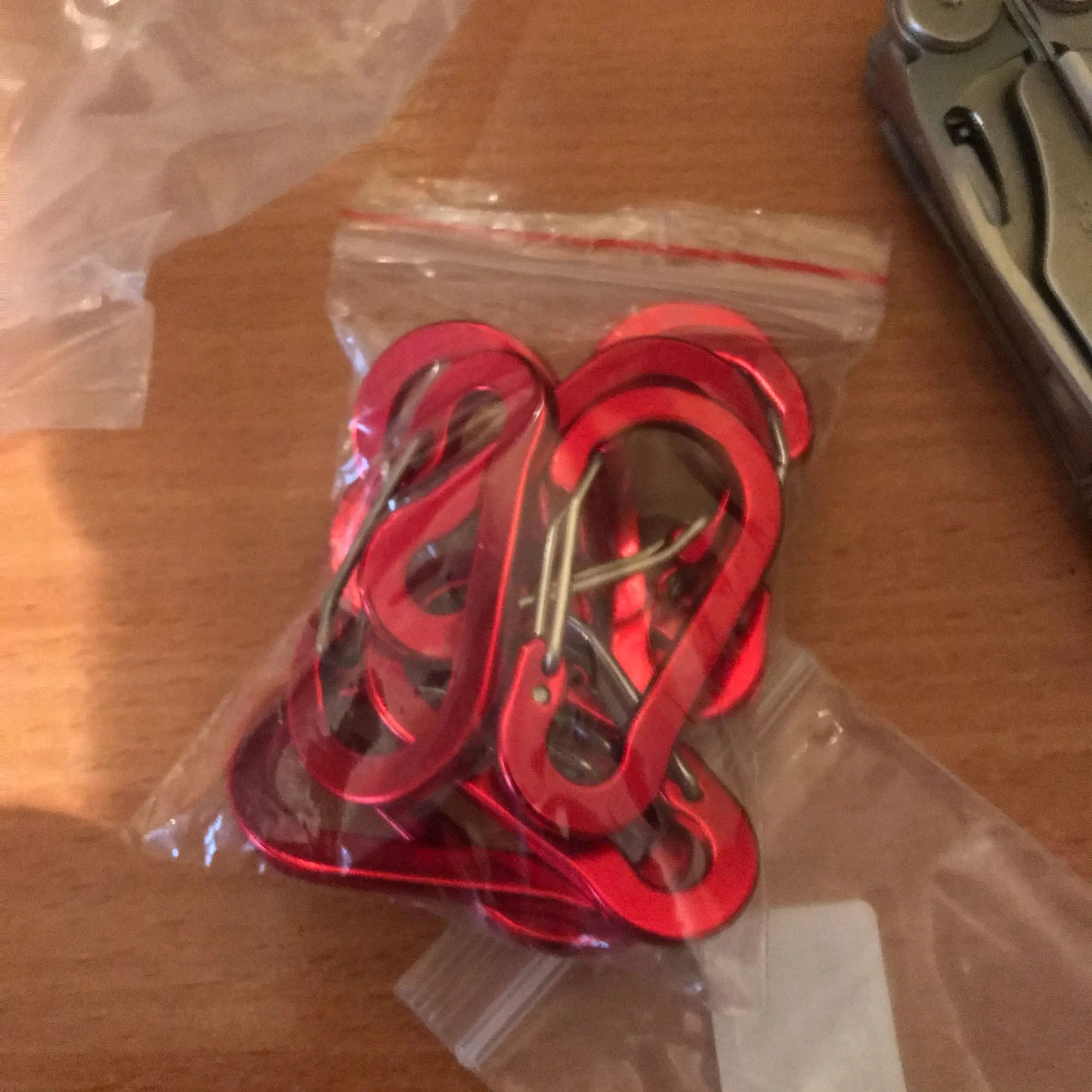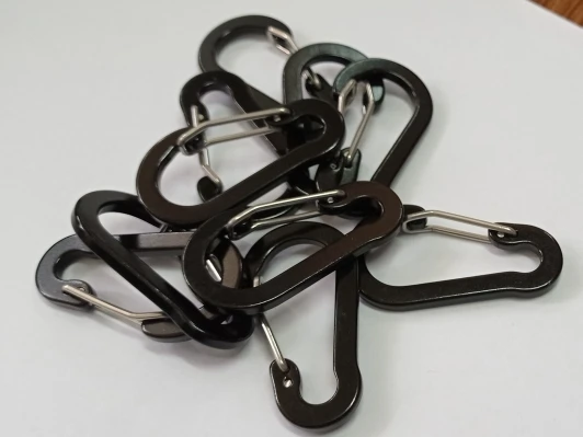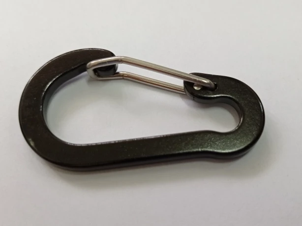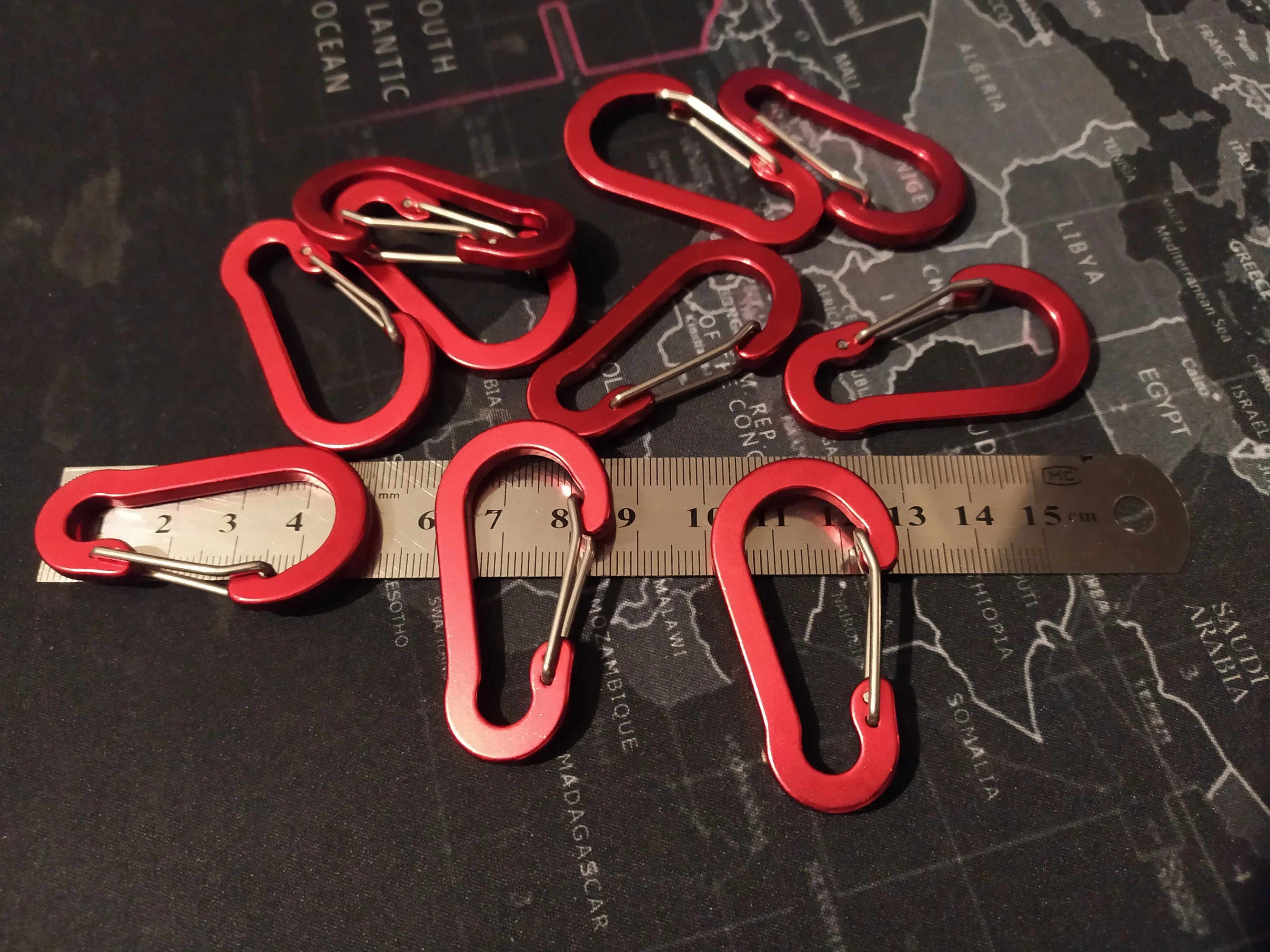 Маленькие карабины. Хорошо продуманный, прочный для размера (он должен держать 10-20 кг, я думаю).