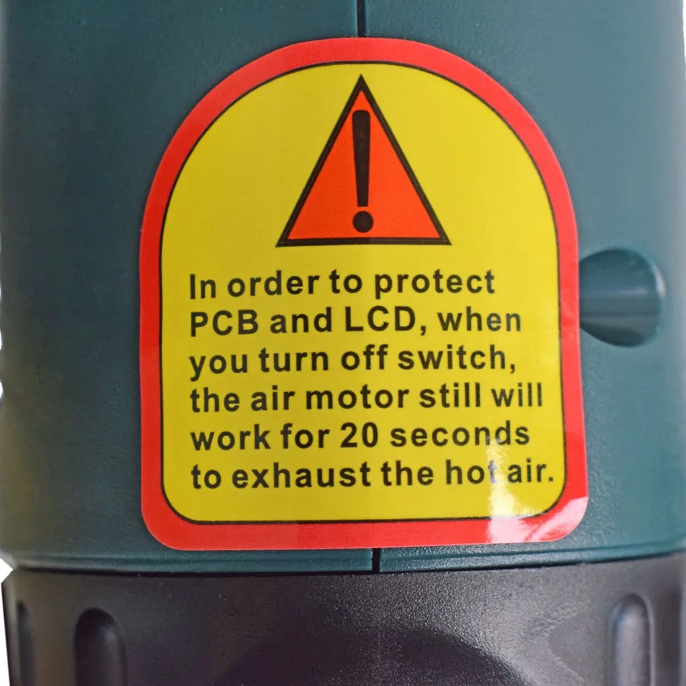 Внимание:Это Тепловая пушка высокой точности.При настройке на 0 передач для закрытия тепловой пушки. Воздушный Двигатель тепловой пушки будет работать в течение 20 секунд до выхода высокотемпературного газа.Это не проблема качества. Мы делаем долгоЛабораторные испытания и доказательства того, что использование защиты за 20 секунд может защитить ЖК-дисплей и печатную плату. Результат-сделать срок службы до 20000 часов.