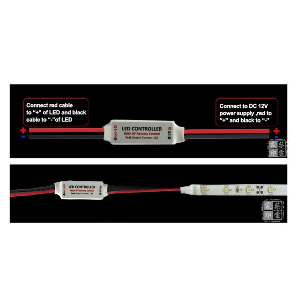Функции для радиочастотного беспроводного пульта дистанционного управления Диммер и динамический 8 динамических эффектов 10-уровневый диммер 256 класс ШИМ Регулируемая скорость Пульт дистанционного управления типа карты Ультратонкий дизайн Эффект плавного диммера От 1 до 1 пульт дистанционного управления в паре Функция автоматического сохранения Установка для радиочастотного беспроводного пульта дистанционного управления 1. Источник питания Этот блок принимает DC 5 V до 24 V источник питания. Красный кабель должен быть подключен к положительному и Черному кабелю к отрицательному. Выберите правильный источник питания в соответствии с приложением светодиодов. 2. Светодиодный выход Красный кабель должен быть подключен к светодиодному положительному и Черному кабелю к отрицательному. Пиковый выходной ток 12А, пожалуйста, уменьшите нагрузку, если основной блок перегревается. Внимание: Не замыкайте светодиодный выход, это может привести к постоянным повреждениям! 3. Пульт дистанционного управления Пожалуйста, вытяните изоляционную часть перед использованием. Радиочастотный беспроводной дистанционный сигнал может проходить через барьер, поэтому нет необходимости нацеливать на основной блок при эксплуатации. Для правильного приема удаленного сигнала не устанавливайте основной блок в закрытых металлических частях. Удаленный аккумулятор 3 в CR2025 типа, пожалуйста, замените только на тот же тип батареи.