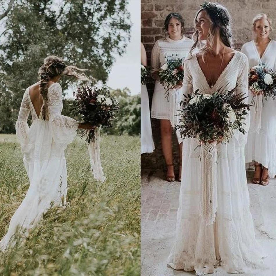 Свадебные платья в богемном стиле, хиппи с V-образным вырезом и длинным рукавом, кружевное пляжное богемное платье с низкой спиной для сада, женское платье большого размера