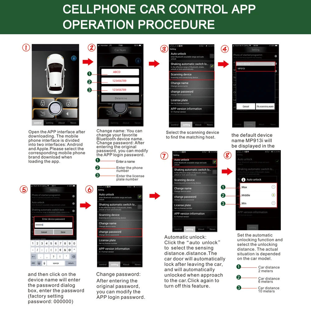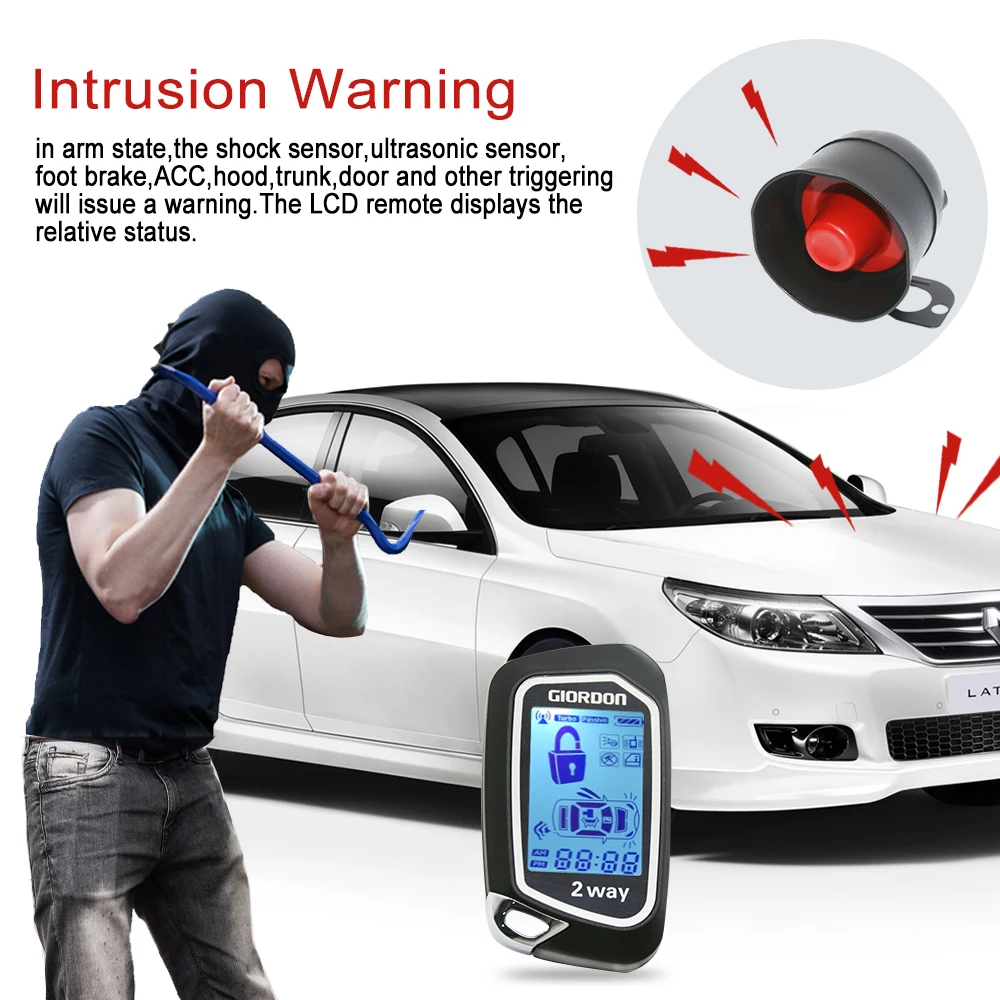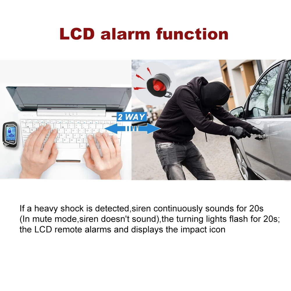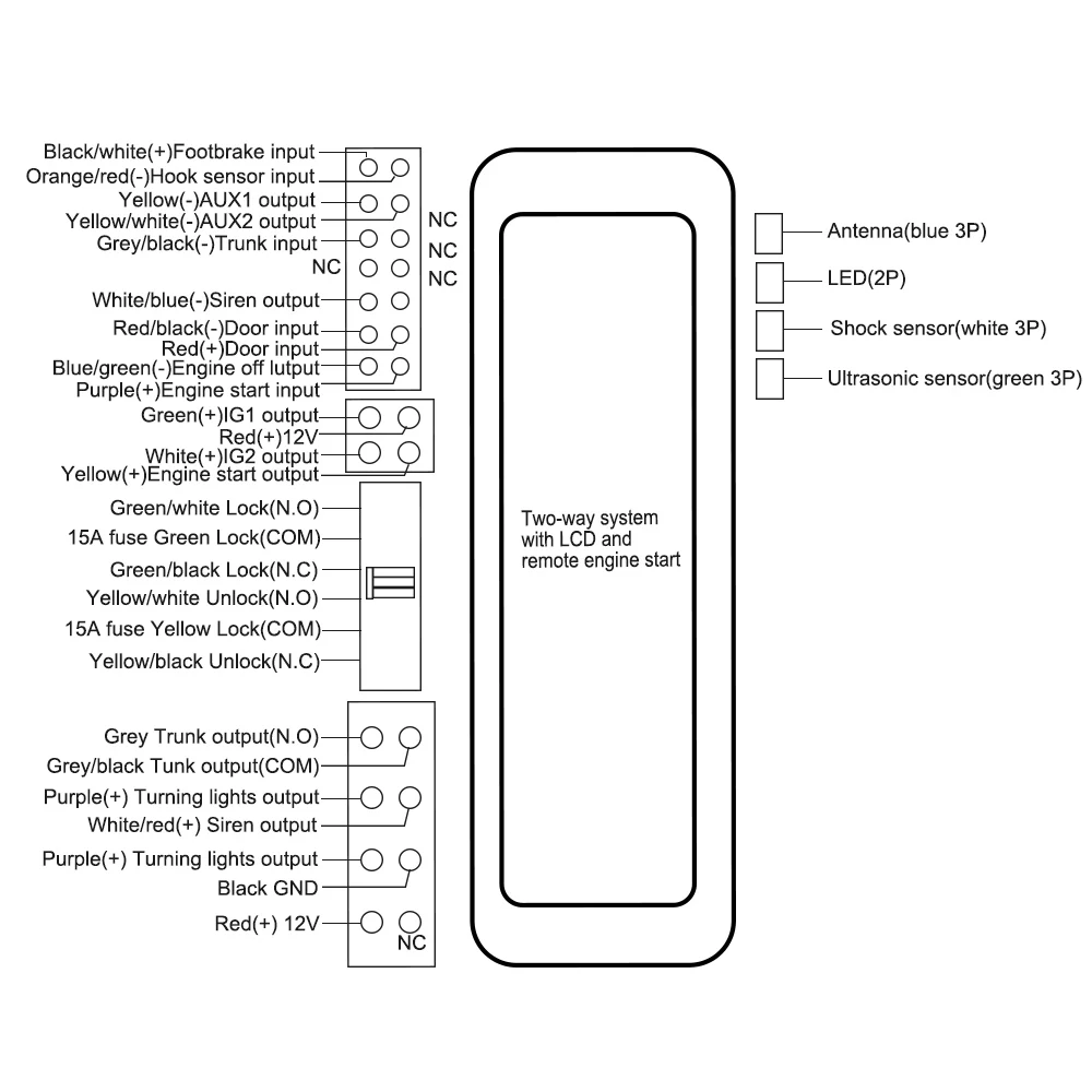 Уважаемые покупателиЭто Двусторонняя Автомобильная сигнализация с ЖК-экраном, которая может дистанционно управлять запуском и остановкой двигателя, таймером запуска двигателя и датчиком вибрации. Этот продукт подходит для 95% бензиновых автомобилей DC12V на рынке. Продукт поставляется с инструкциями пользователя и схемами проводки на английском и русском языках.Английская версия для русской версии1. Рычаг и замок2. Демонтаж и разблокировка3. Автоматический повторный рычаг4. Запуск двигателя (только для модели запуска двигателя)5. Турбо таймер ВКЛ/ВЫКЛ (только для моделей с запуском)6. Пульт дистанционного управления ствола7. ЖК-пульт дистанционного управления и настройки вибрационного переключателя дистанционного управления8. Режим отключения звука9. Дистанционная Блокировка10. Режим Valet11. Датчик удара ВКЛ/ВЫКЛ (эта функция подходит только для некоторых моделей)12. Предупреждение о вибрации (включена только функция датчика удара)13 Предупреждение предупреждение lntrusion14. Пассивное оружие15. Замок привода16. Вспышка открытых дверей17. Память о сбое питания18. Срабатывание19. Метод дистанционного обучения20. Мобильный телефон (сканирование qr-кода или загрузка и установка нашего приложения Bluetooth для управления автомобилем)