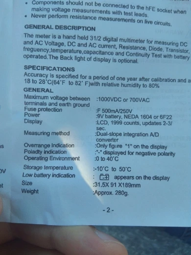 Вроде отличный мультиметр , есть подставка , щупы на температуру , но в комплекте нет батарейки на 9 вольт
