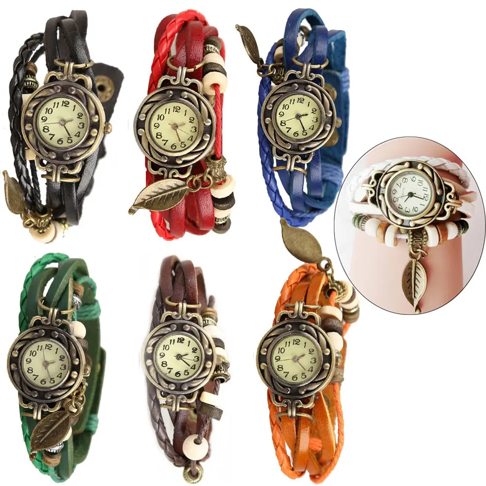 Винтажный Браслет, кварцевые наручные часы с плетеной окантовкой, кожаный ремешок, листья, бусины для женщин, магазин NYZ