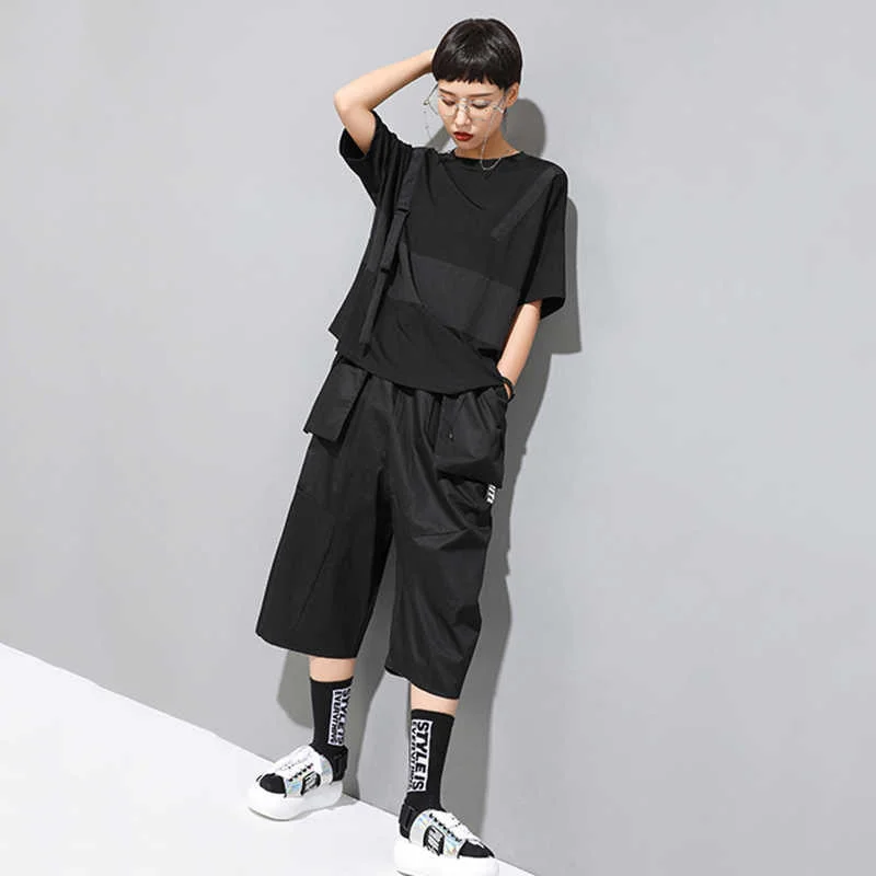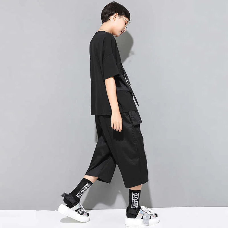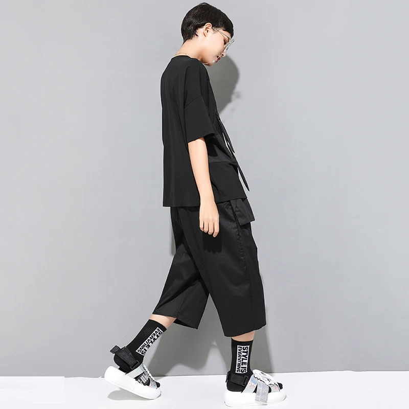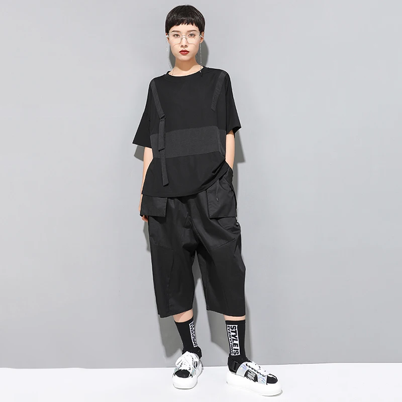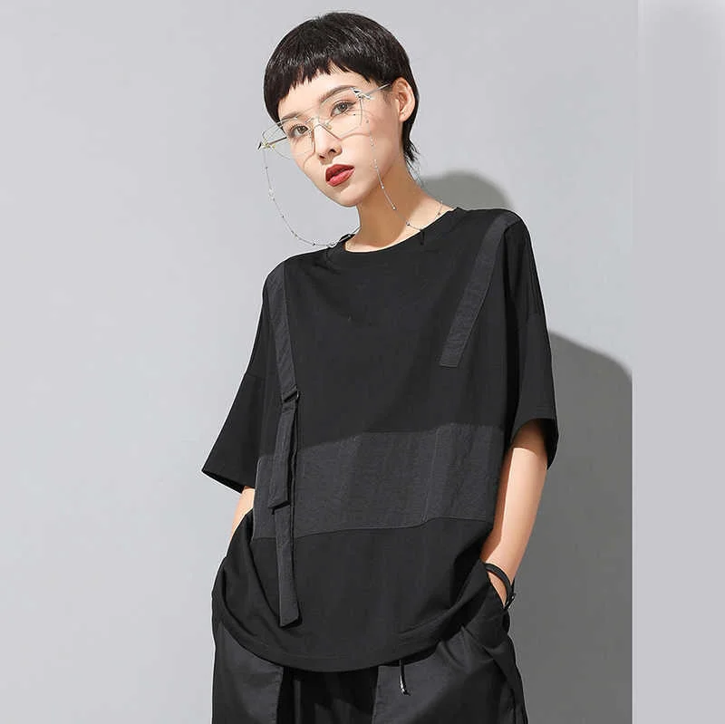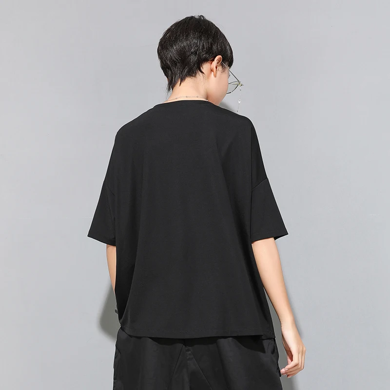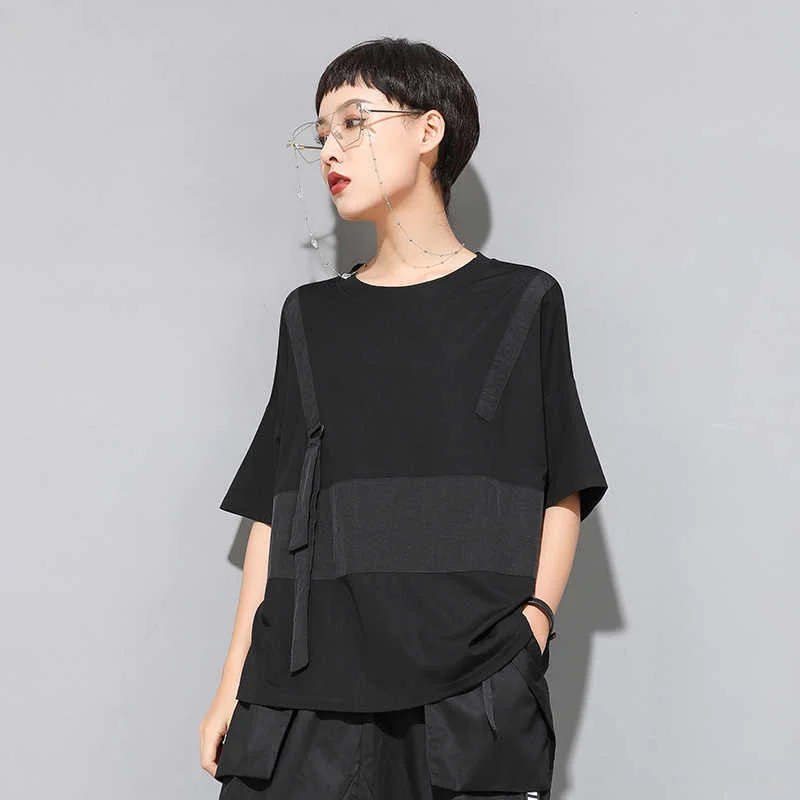 EAM Женская Черная футболка контрастных цветов с разрезом большого размера, новая модная футболка с круглым вырезом и коротким рукавом, весна-лето 2022 1U136