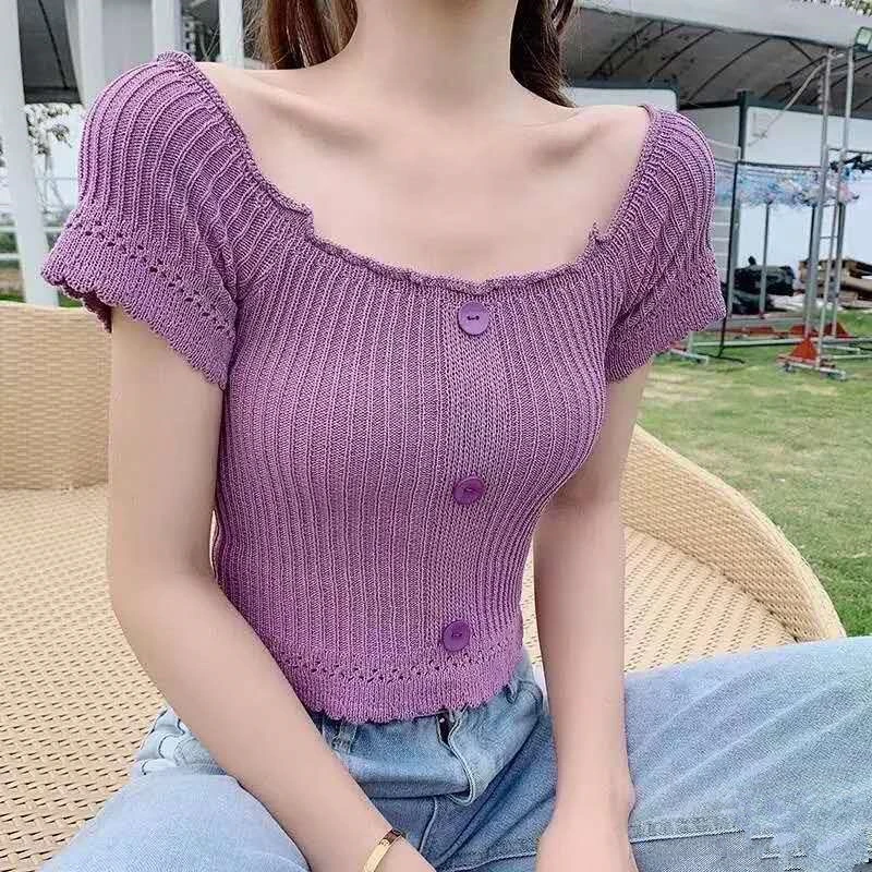 HELIAR женские футболки на пуговицах, укороченные женские топы с квадратным воротником и открытыми плечами, женские весенние Рубашки с коротким рукавом