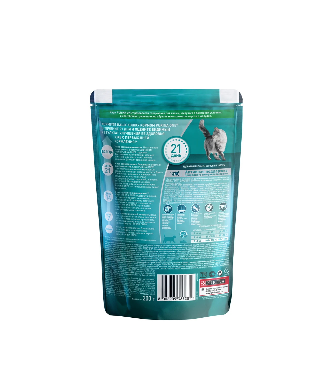 Домашние кошки проводят много времени, ухаживая за своей шерстью, что часто приводит к образованию волосяных комков в желудке, которые могут доставить дискомфорт. Также они ведут менее активный образ жизни. В результате их потребность в энергии снижается, и они становятся склонными к набору лишнего веса. Корм Purina ONE разработан специально для кошек, живущих в домашних условиях, и способствует уменьшению образования комочков шерсти в желудке. Способствует выведению комочков шерсти из желудка благодаря наличию клетчатки. Формула с содержанием цикория, высококачественного натурального ингредиента, помогает уменьшить неприятный запах от туалетного лотка, способствует балансу микрофлоры кишечника и поддерживает здоровую пищеварительную систему. Благодаря оптимальному соотношению белков и жиров корм помогает поддерживать здоровье кошки.