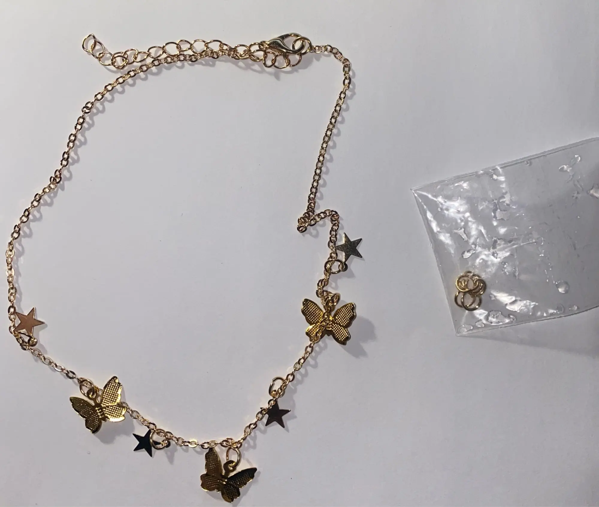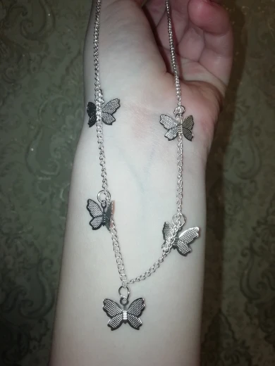ещё одна цепочка, но бабочки отпадают, продавец отправил вместе с цепочками ещё дополнительно пакетик с запасными закрепками, чтобы если отпали, можно было прикрепить заново. посылка шла в москву около 3-4 недель(почти месяц)