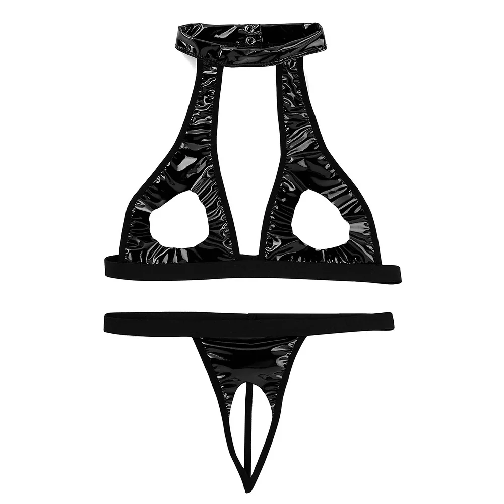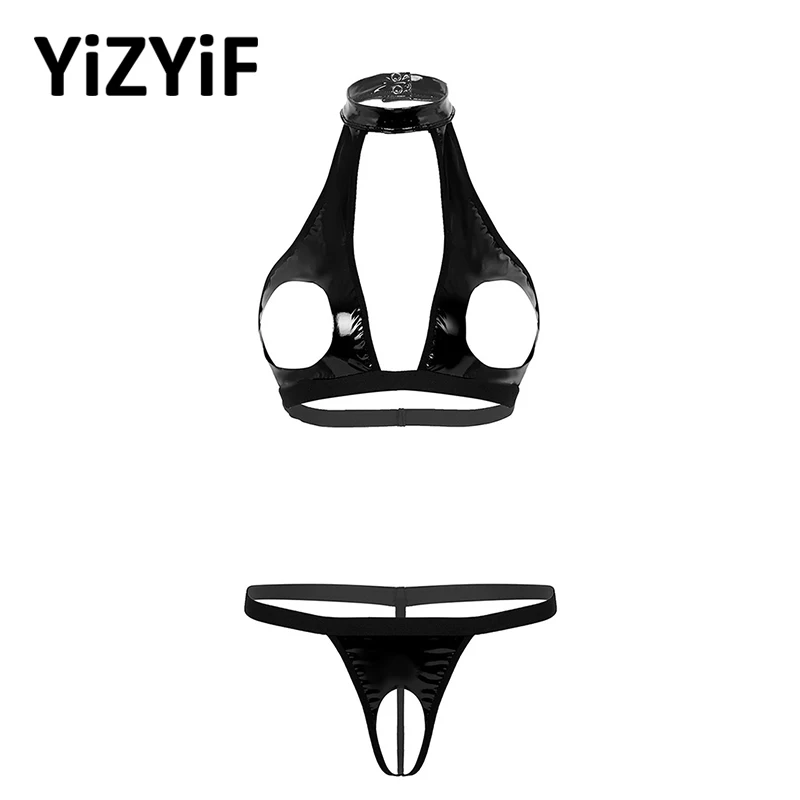 Женский сексуальный бюстгальтер с открытой чашкой, Комплект эротического нижнего белья из искусственной кожи с мокрым эффектом, сексуальная одежда, Эротический бюстгальтер, топ с нижним бельем