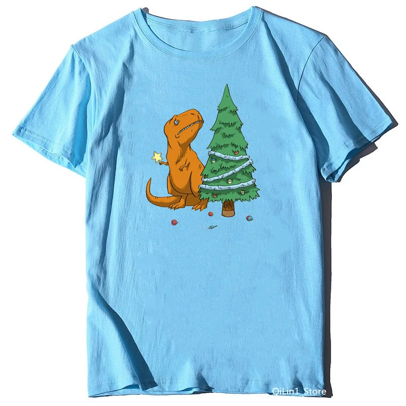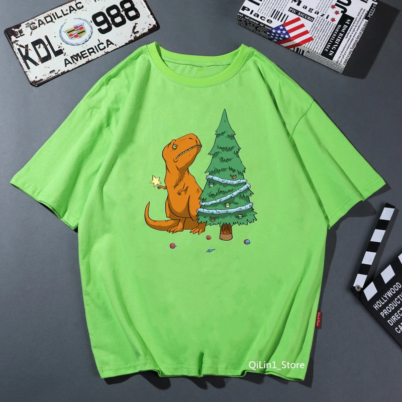 Футболка женскаяМужская однотонная с забавным принтом в виде динозавра и рождественской елки
