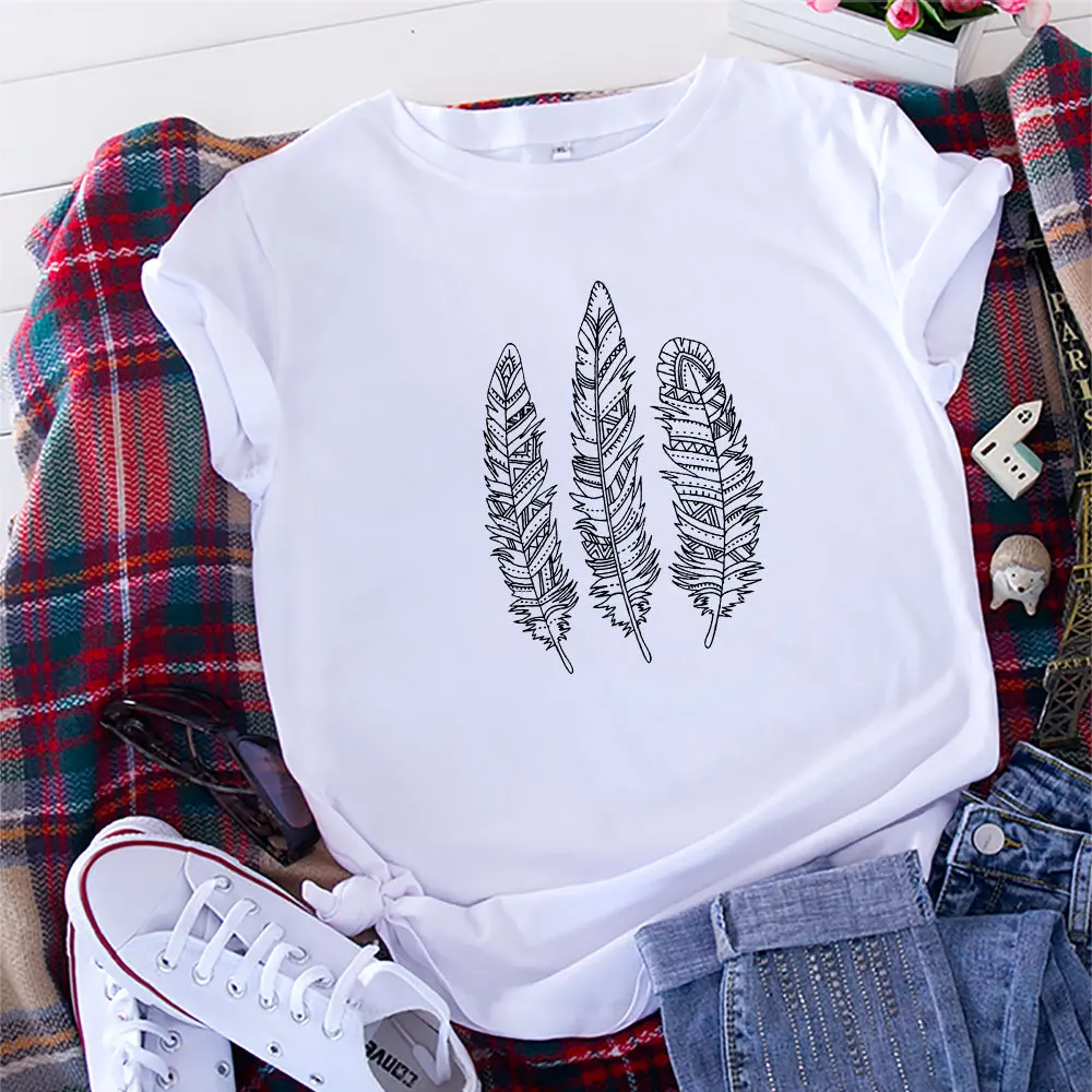 Футболка женская, короткие рукава уличная одежда хлопок, с принтом в виде перьев, 100%