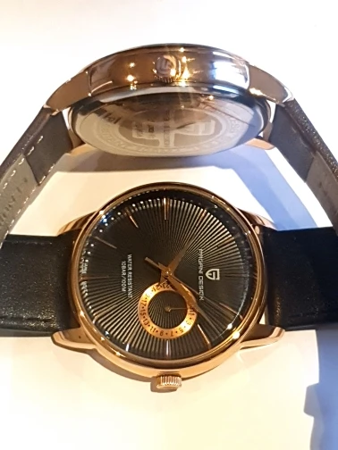 Заказал золотую отделку. Черное лицо и ремешок. Дизайн Pagani делает хорошие часы. Это @ нижний конец своей ценовой точки. Поэтому нельзя ожидать, что часы будут храниться в соответствии с их высокими стандартами. Первые впечатления-это то, что часы в порядке. Золотистый цвет может занять некоторое время. При наблюдении за часами, это не подчёркивает то, что вы видите. Я укажу свою покупку в порядке. Часы выглядят так, как описано.