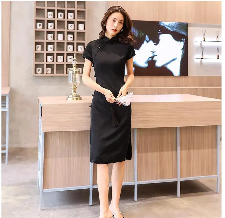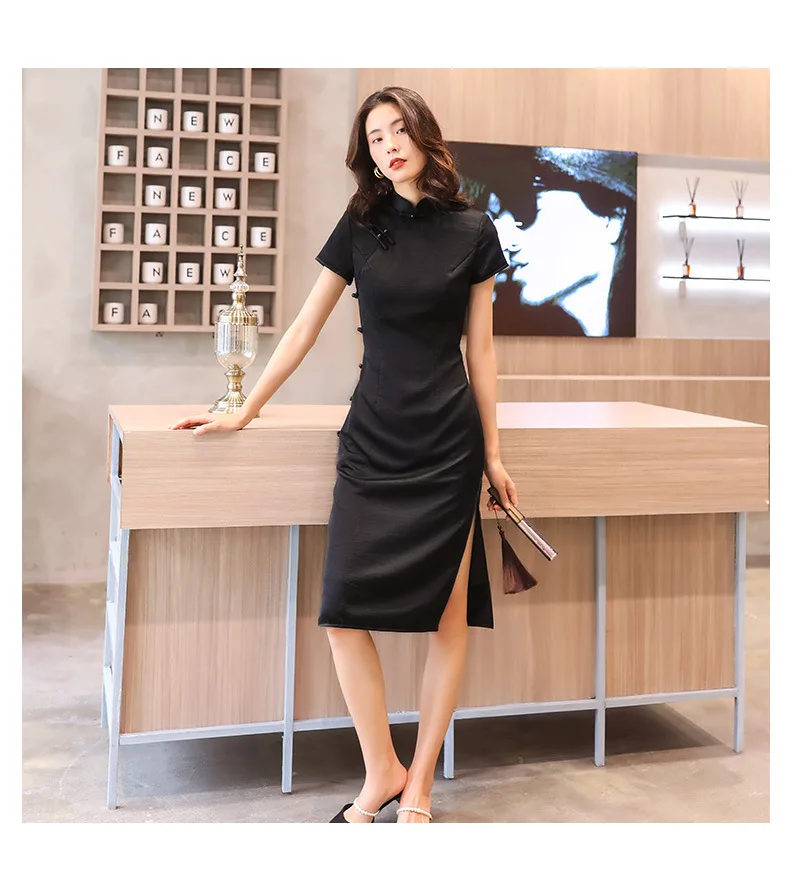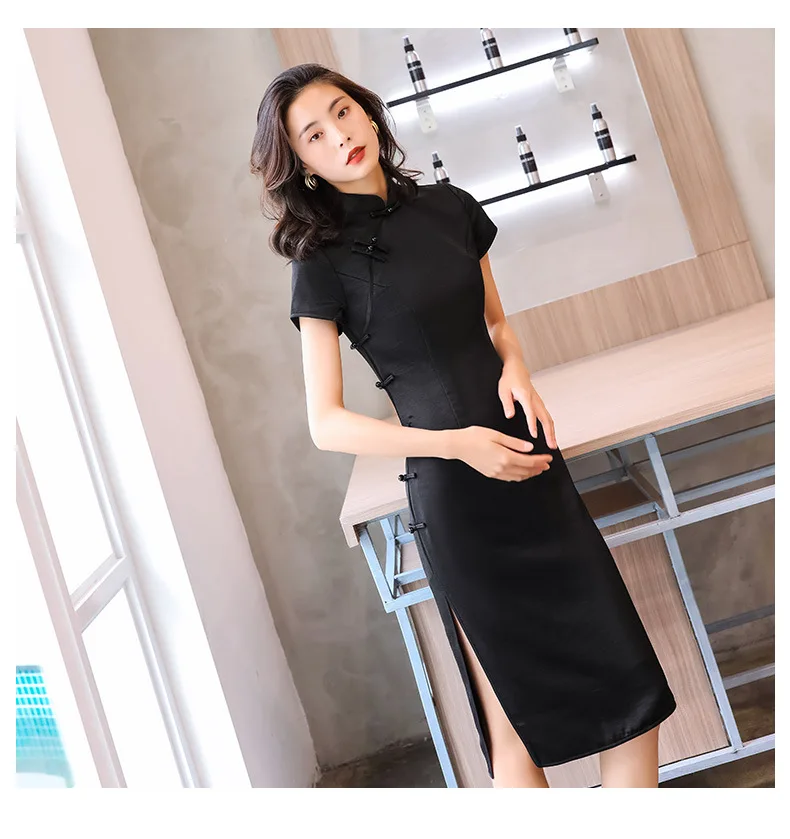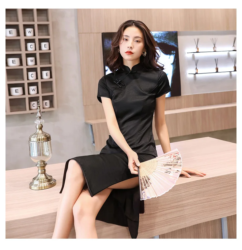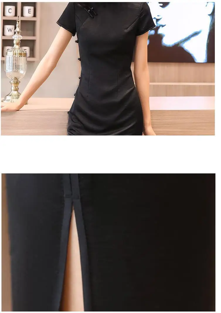 Чёрное женское Ципао, винтажное, с воротником-стойкой в китайском стиле, элегантное, классическое, приталенное, с высоким разрезом, размера плюс