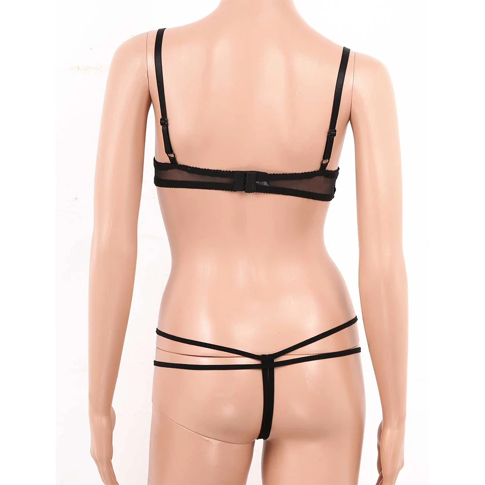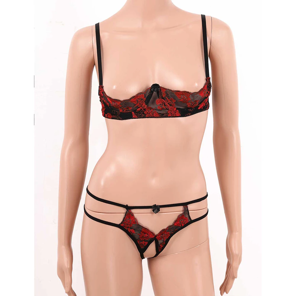 Женский кружевной Комплект эротического нижнего белья с вышивкой, открытые чашечки бюстгальтер с открытой грудью, топ с вырезами, стринги, бикини